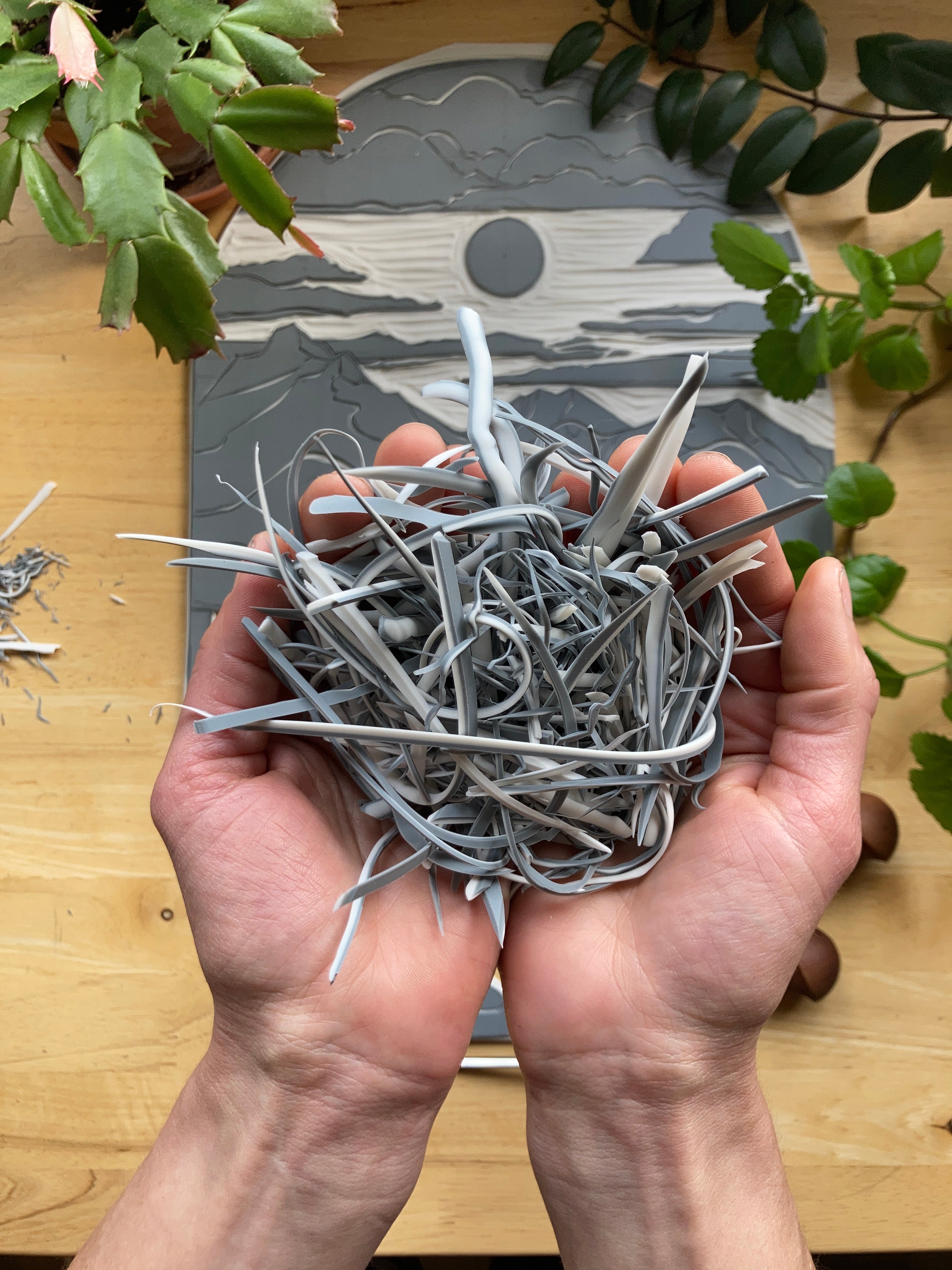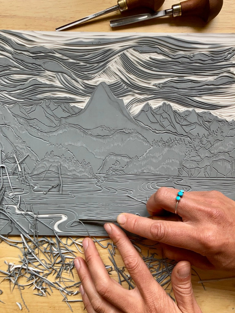 Using sharp tools, I carve the block away - this determines which parts of the print will get inked in the final print. Think of this step as if I'm making my own rubber stamp.