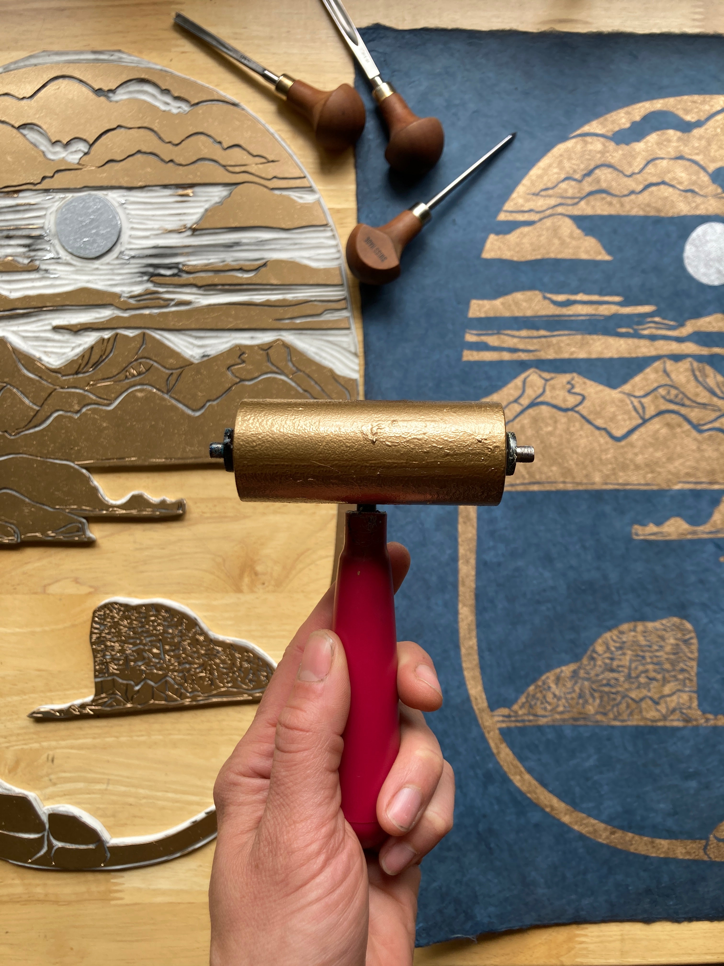 I roll ink over the block using a brayer. It's all about balance: too much ink and the finer details will be lost, too little ink, and the final print will be patchy. I use archival, oil based inks.