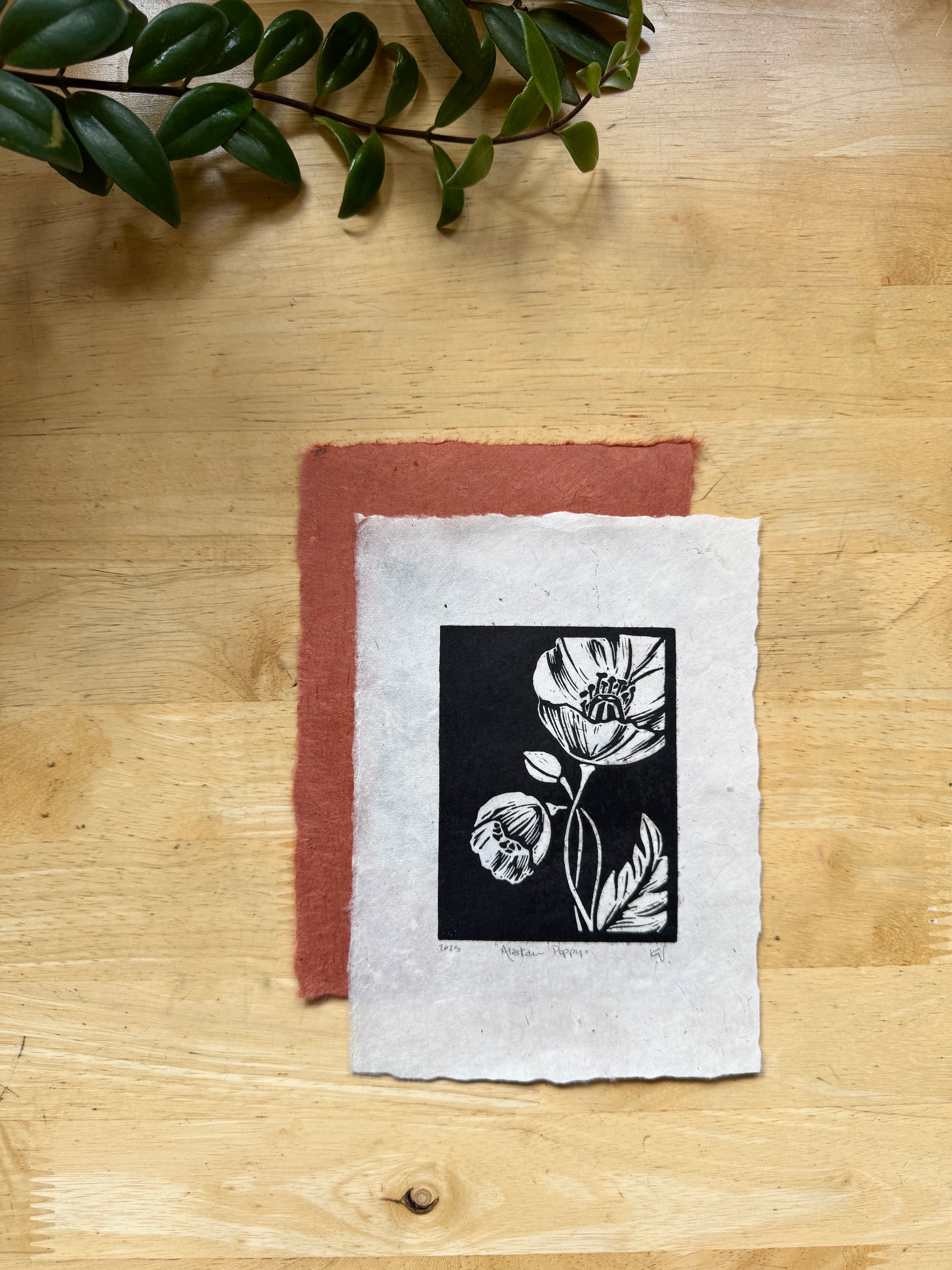 Ink is archival, oil-based and velvety black. Printed on acid free, natural Lokta paper. This is a sustainable paper, handmade in Nepal, with gorgeous flecks of fiber and texture - due to the handmade nature, sizing is not exact!