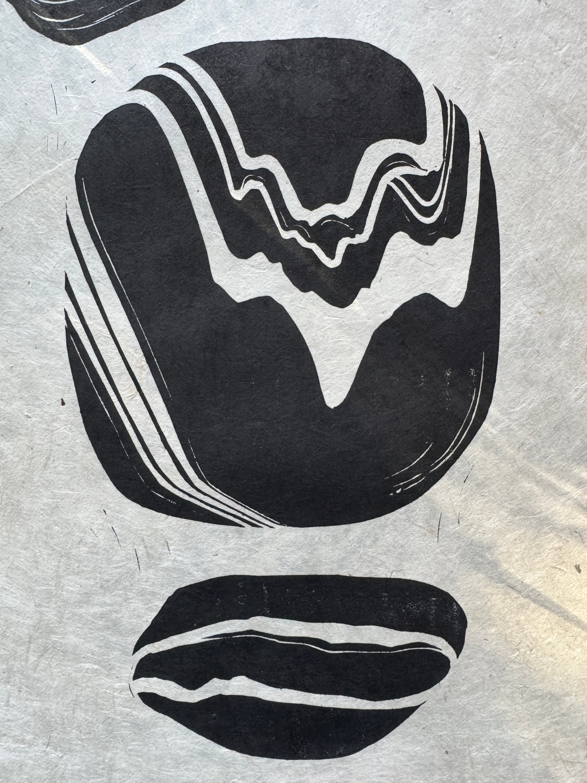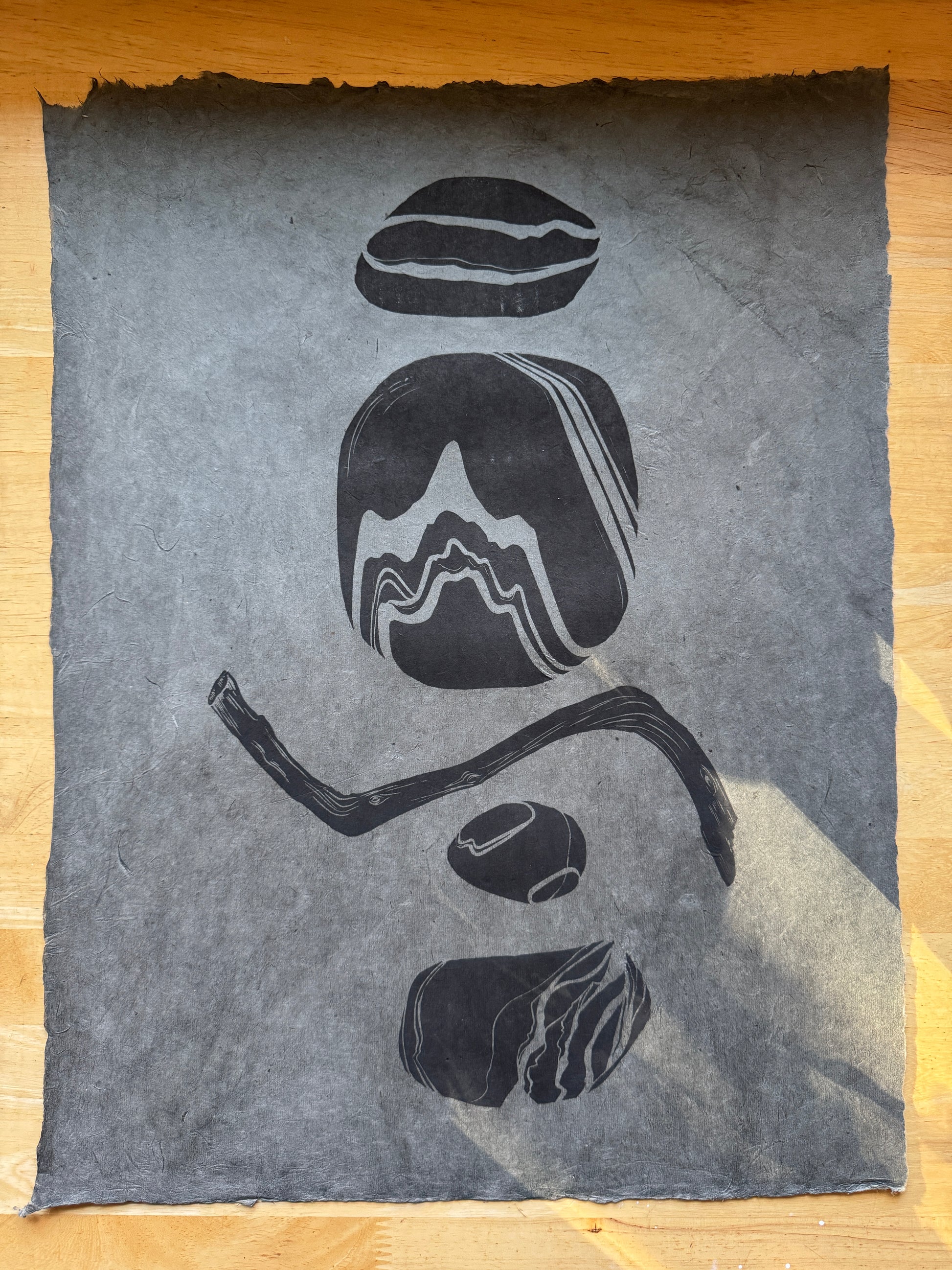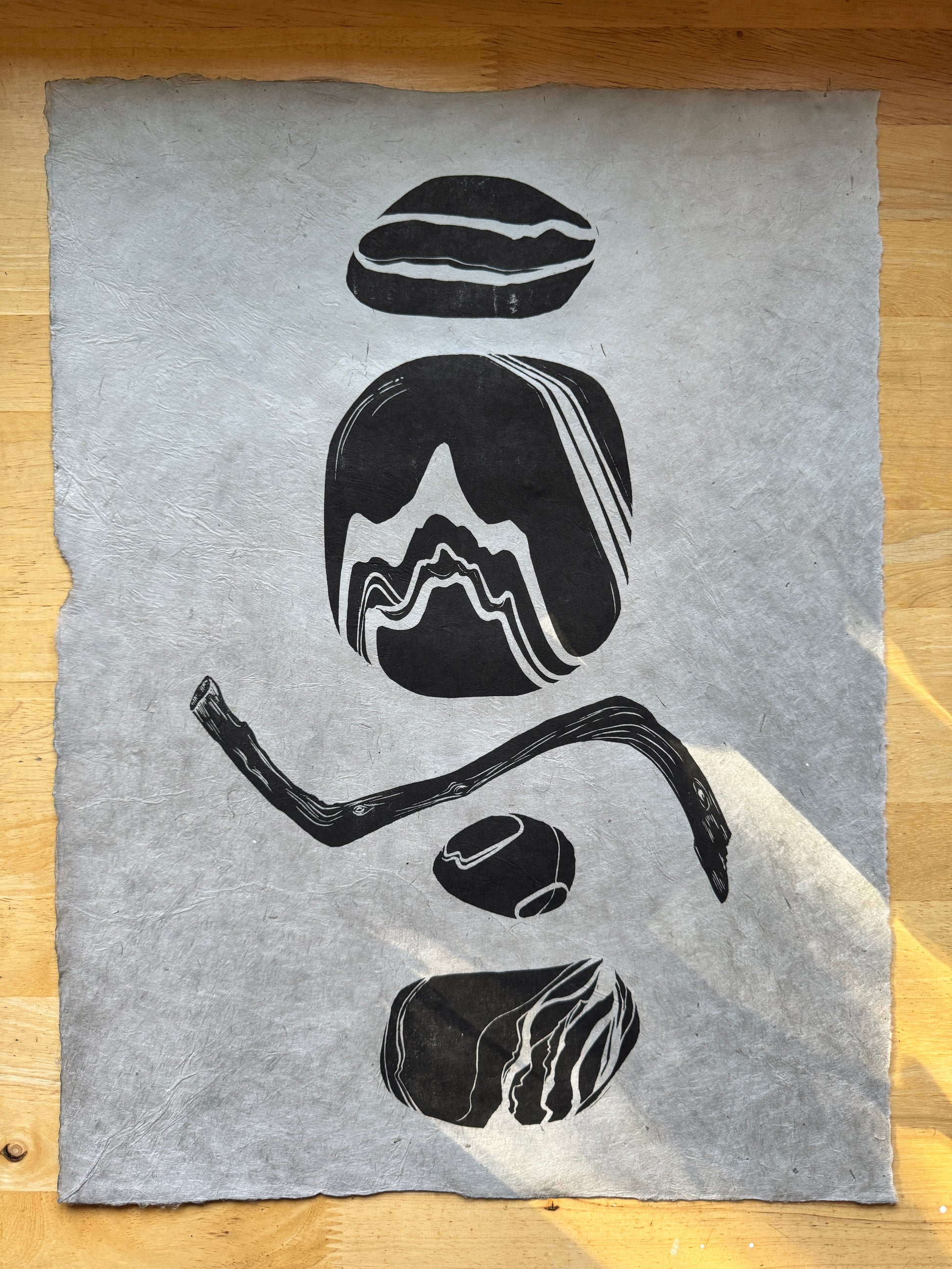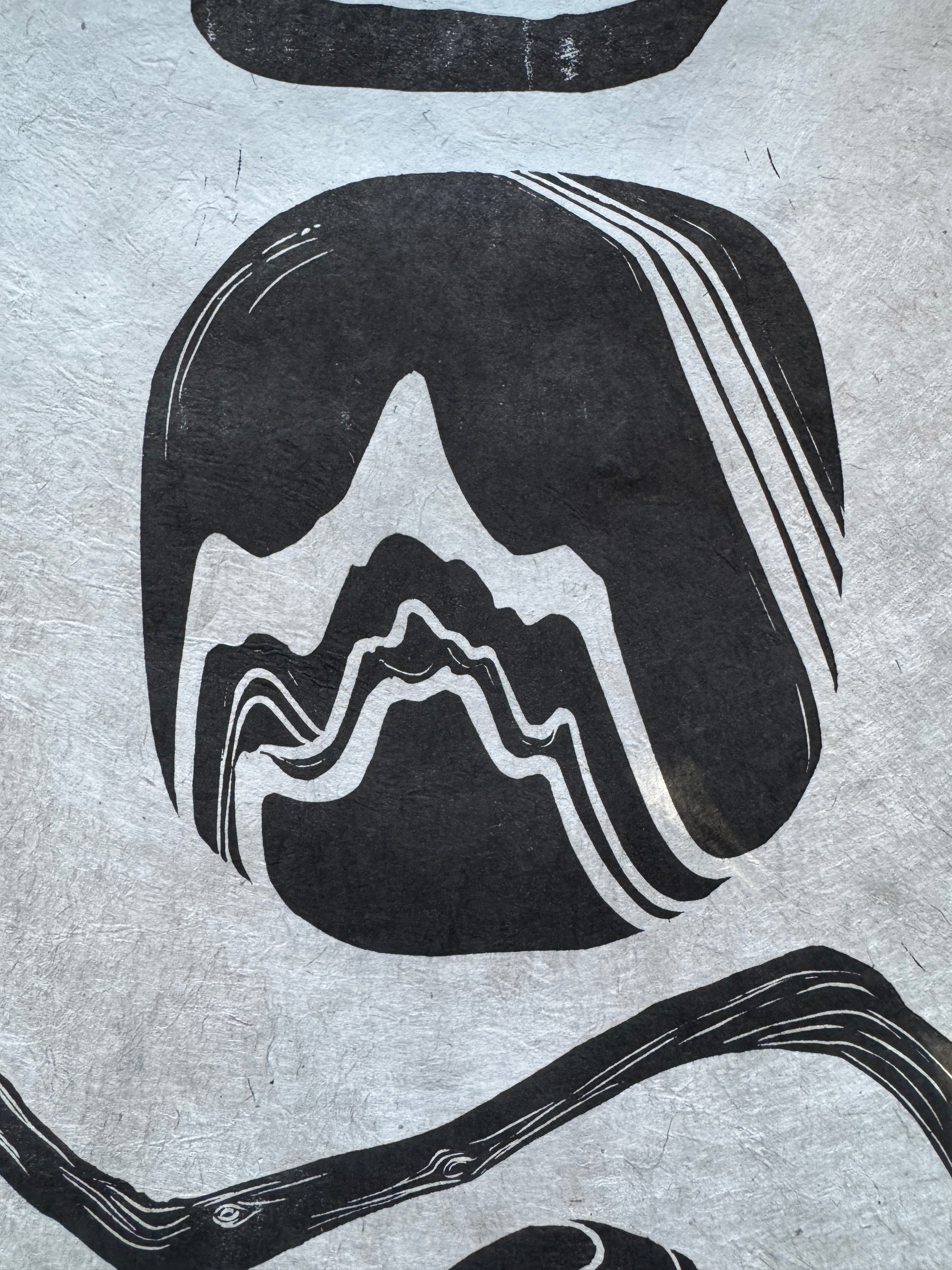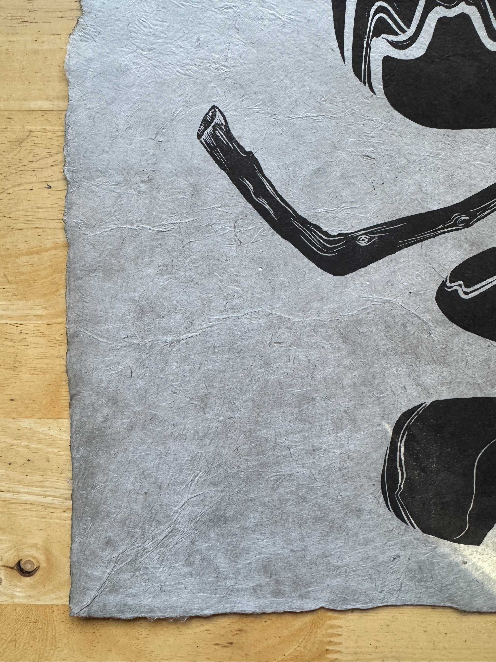 Prints are individually inked and pressed using archival, oil-based inks on beautifully textured Lokta paper. This is a sustainable paper, handmade in Nepal with gorgeous flecks of fiber and texture. Each print is pressed by me with unique variations from print to print, beautifully original.