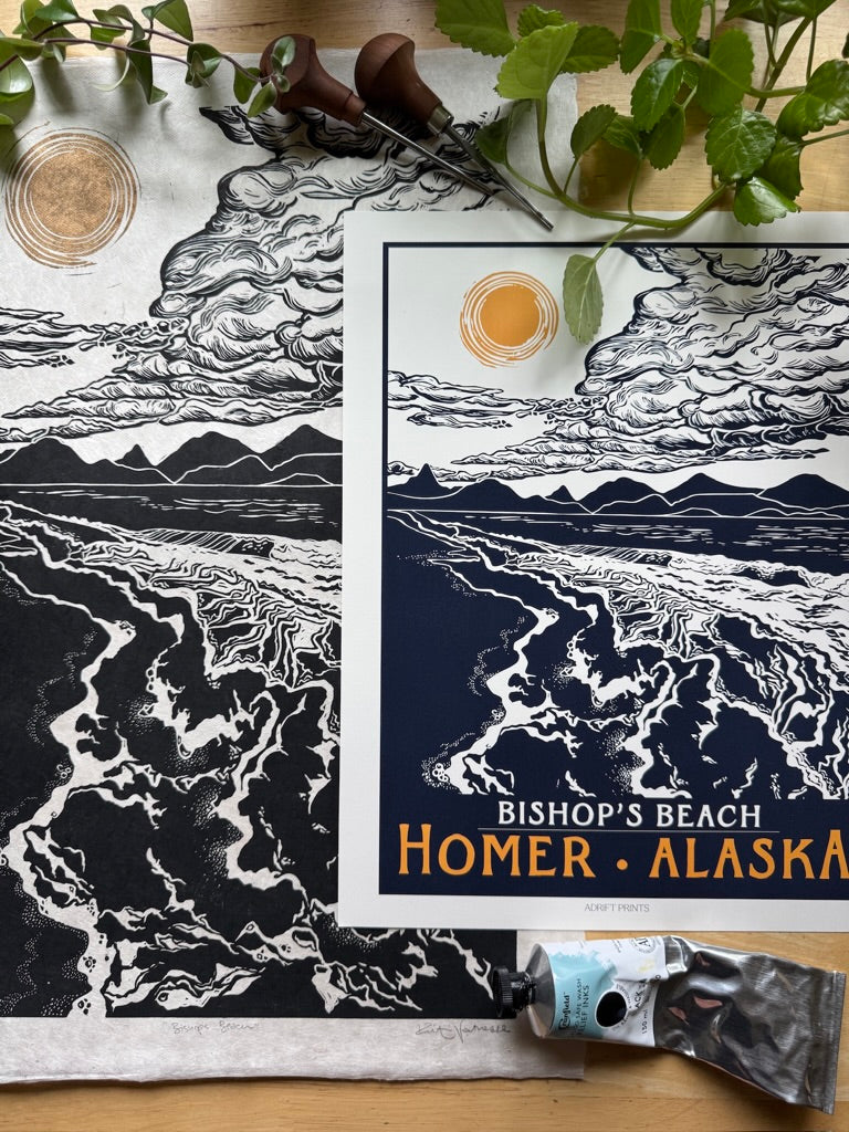 Originally, a hand-carved 16"x20" linocut print, I re-imagined this print as a travel poster; text and color added digitally.