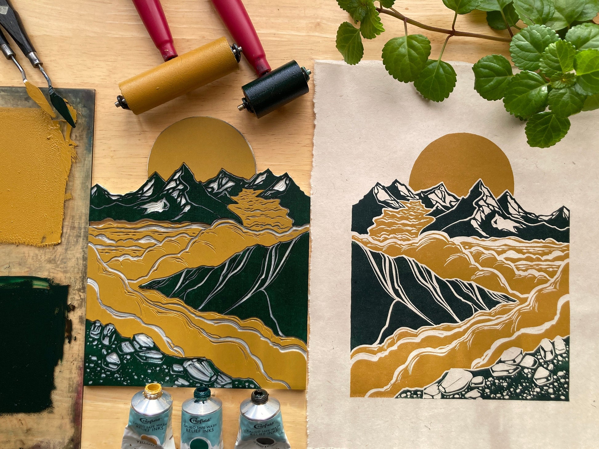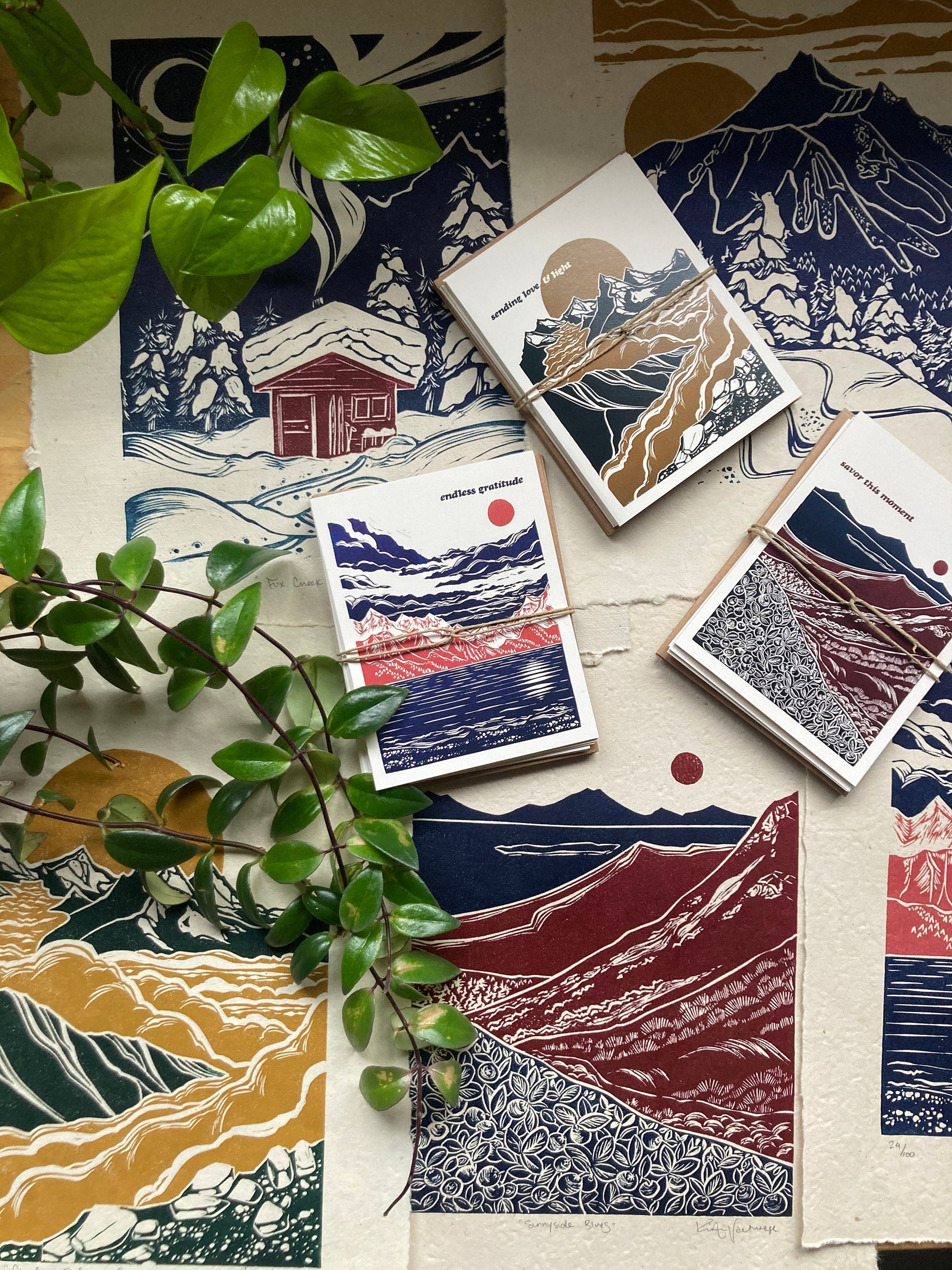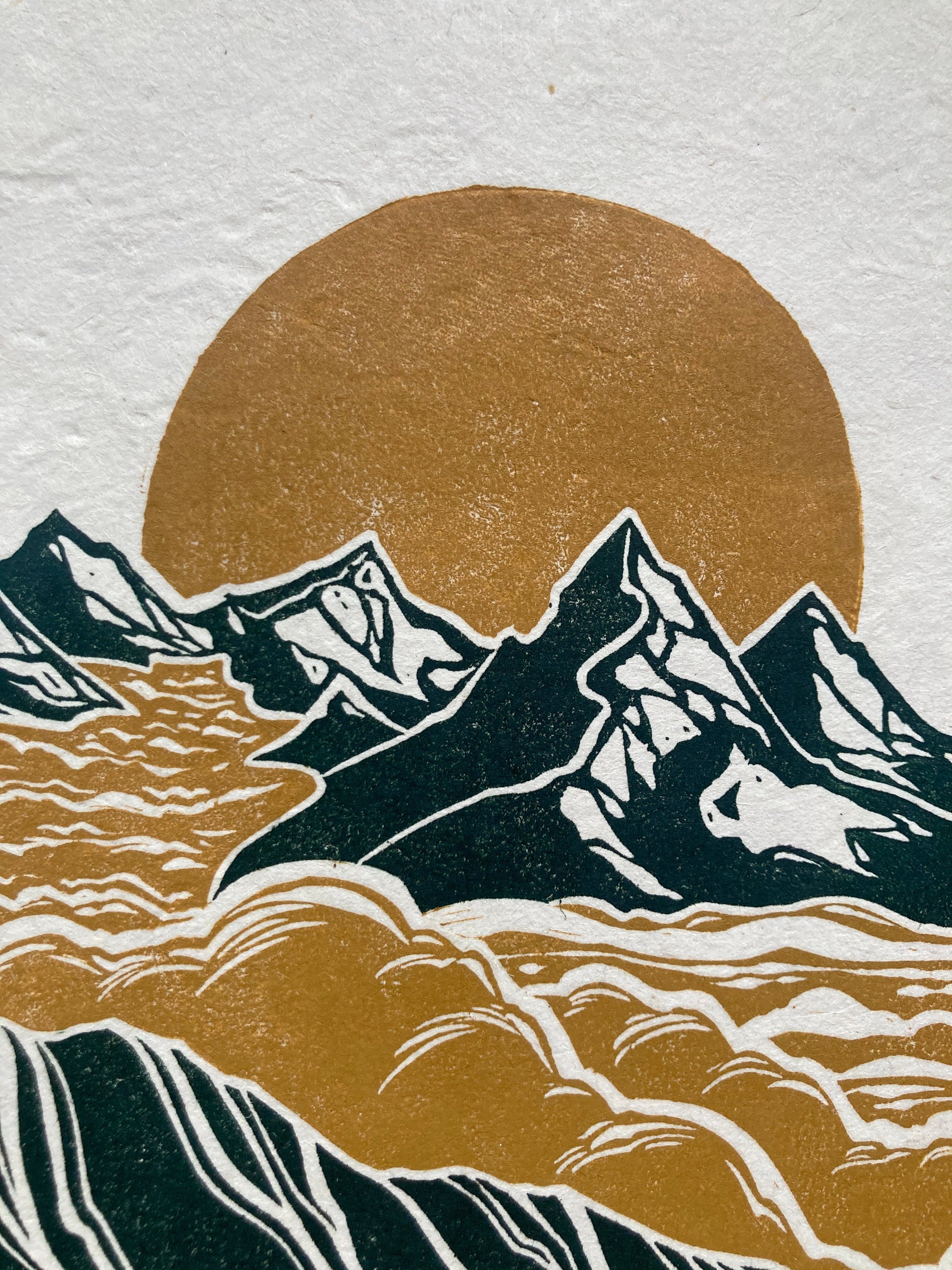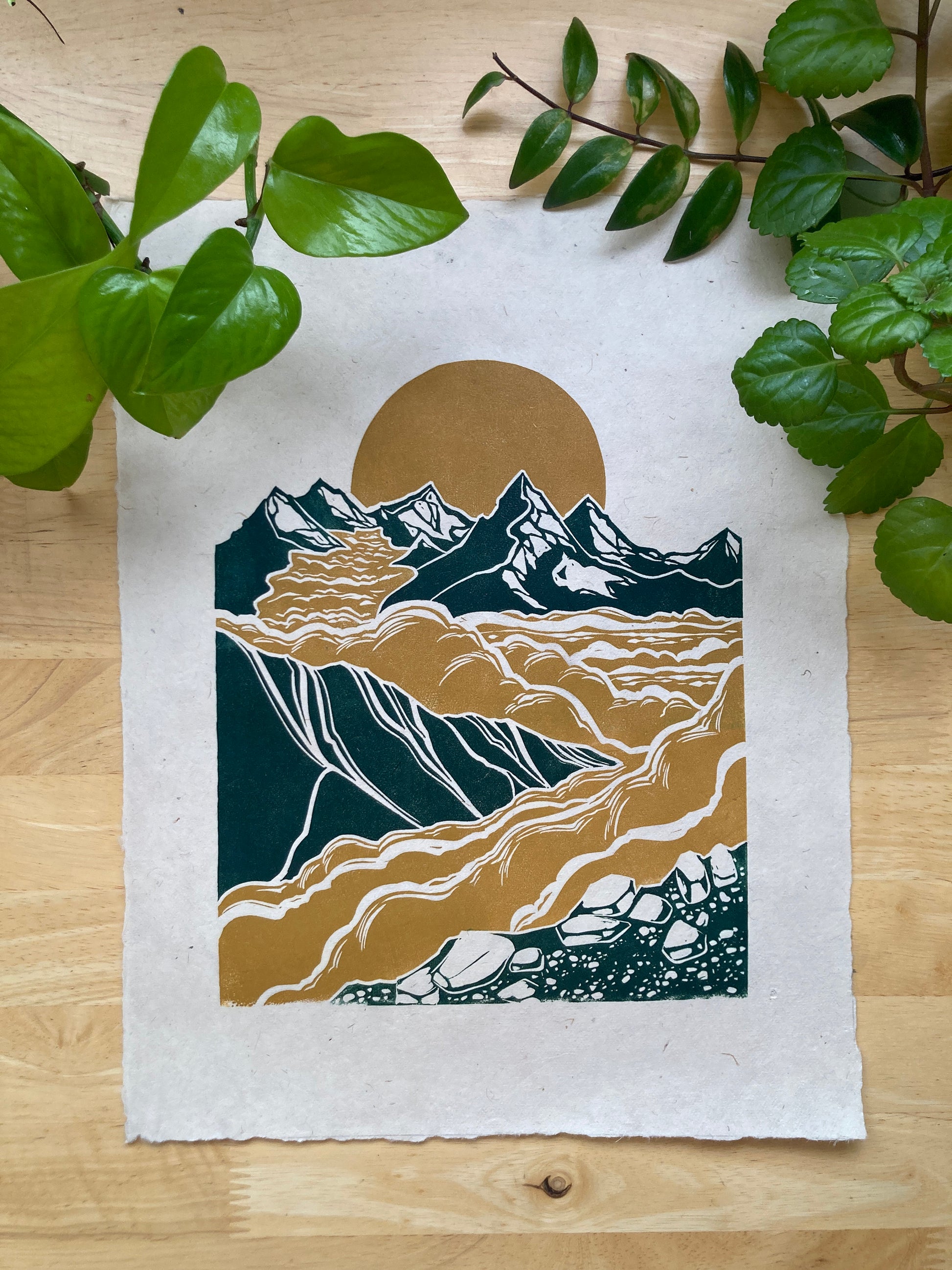 Prints are individually inked and pressed using archival, oil-based inks on beautifully textured Lokta paper. Lokta is a sustainable paper, handmade in Nepal with gorgeous flecks of fiber and texture. Each print is pressed by me with unique variations from print to print, perfectly original.