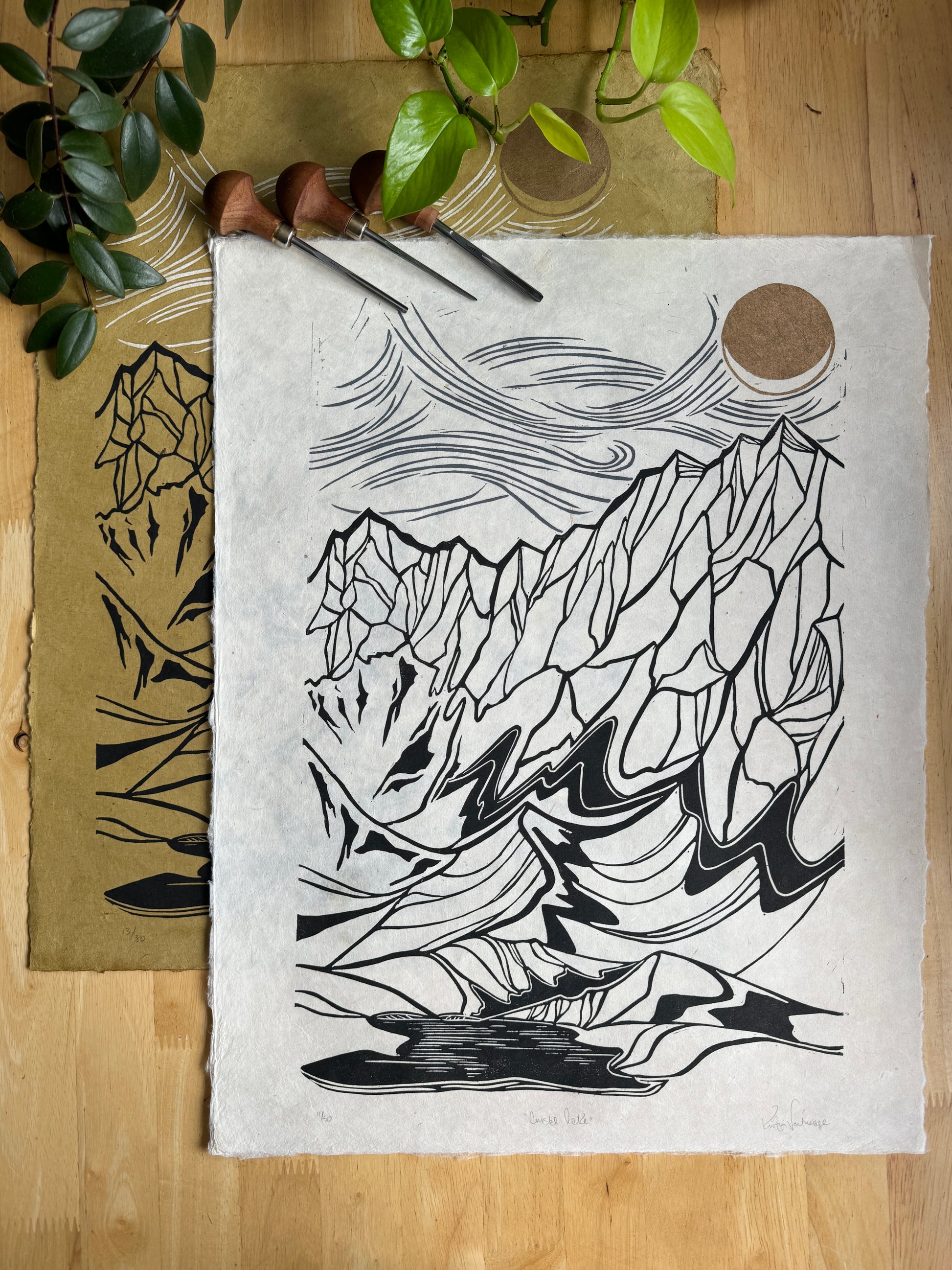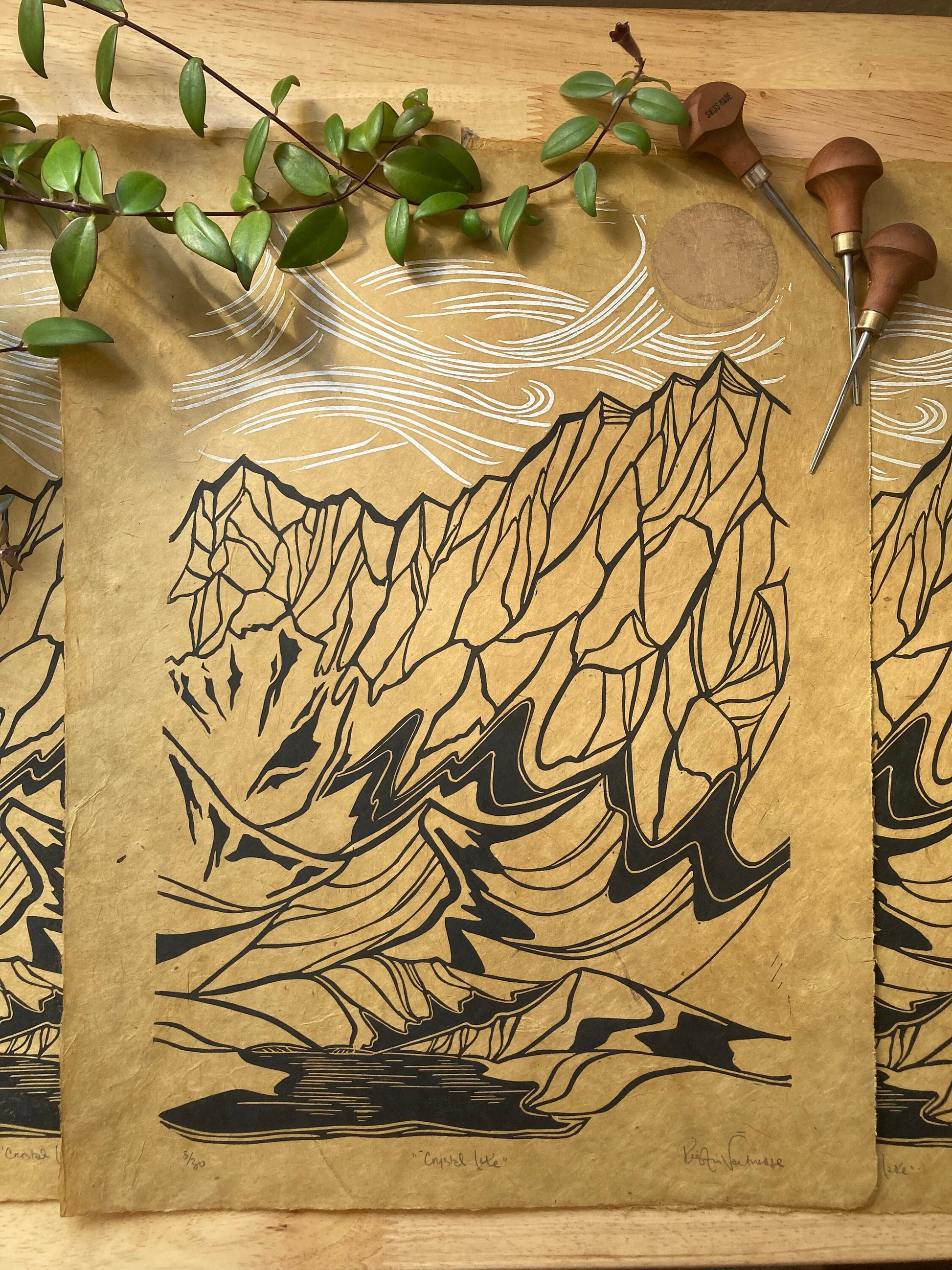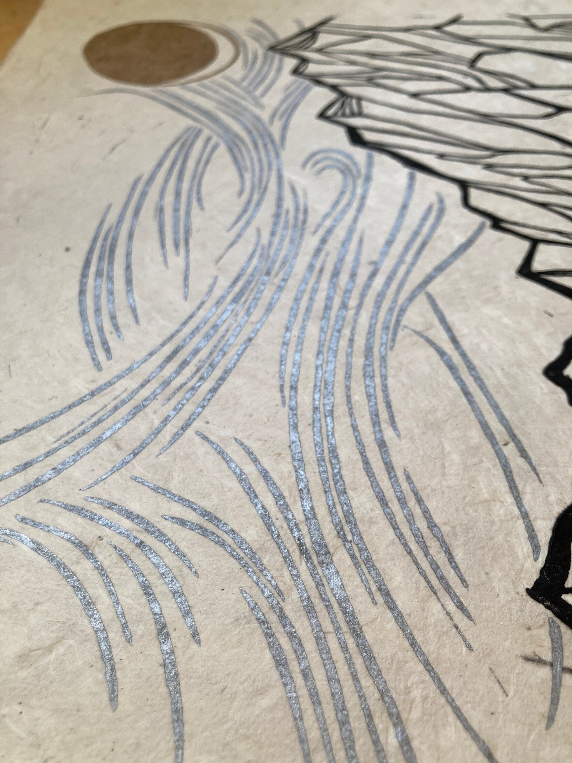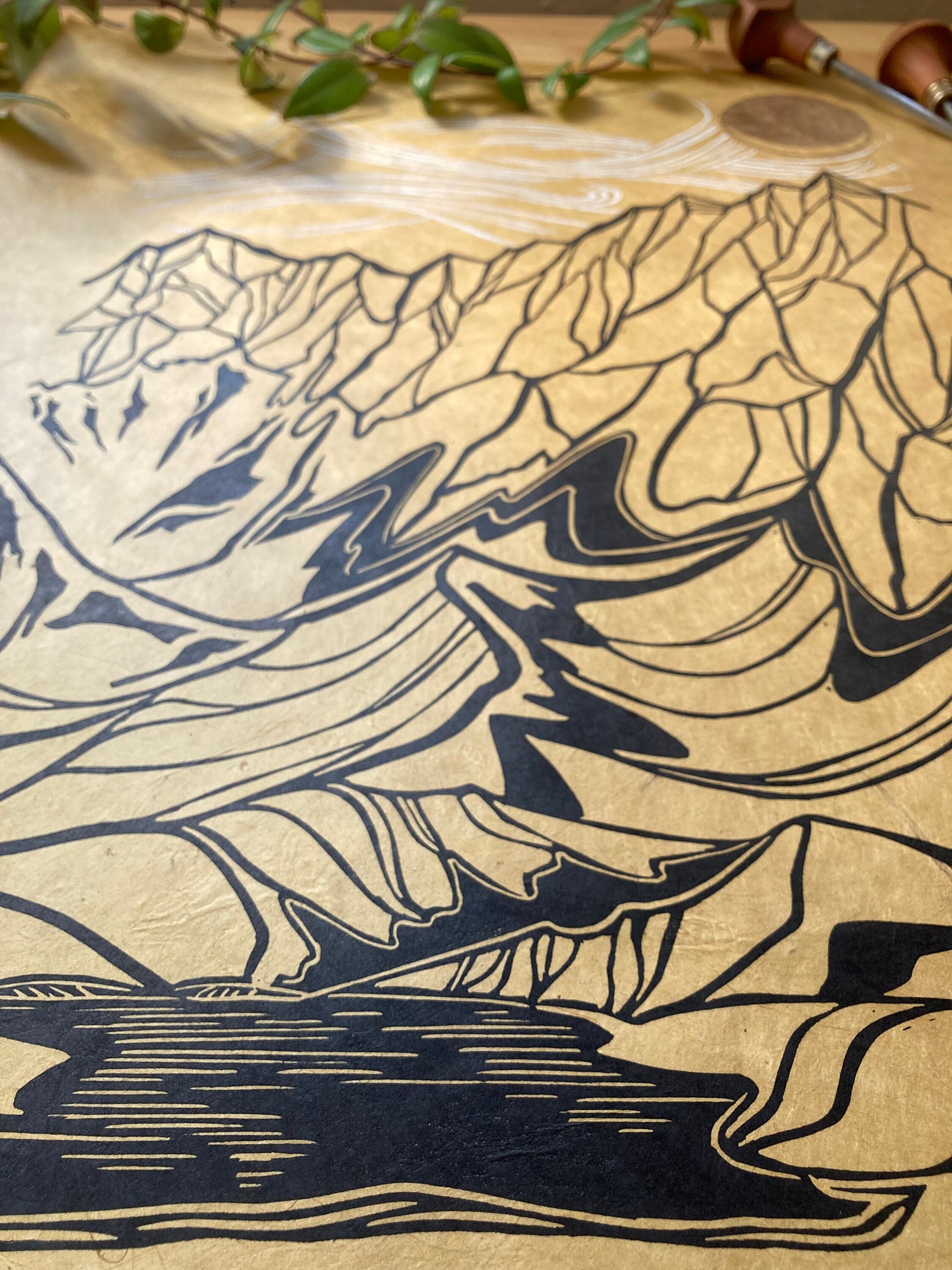 Each linocut print is individually inked and pressed using archival, oil-based inks on naturally textured Lokta paper. This is a sustainable paper, handmade in Nepal with gorgeous flecks of fiber and texture. Each print is pressed by me, with unique variations from print to print, beautifully original.