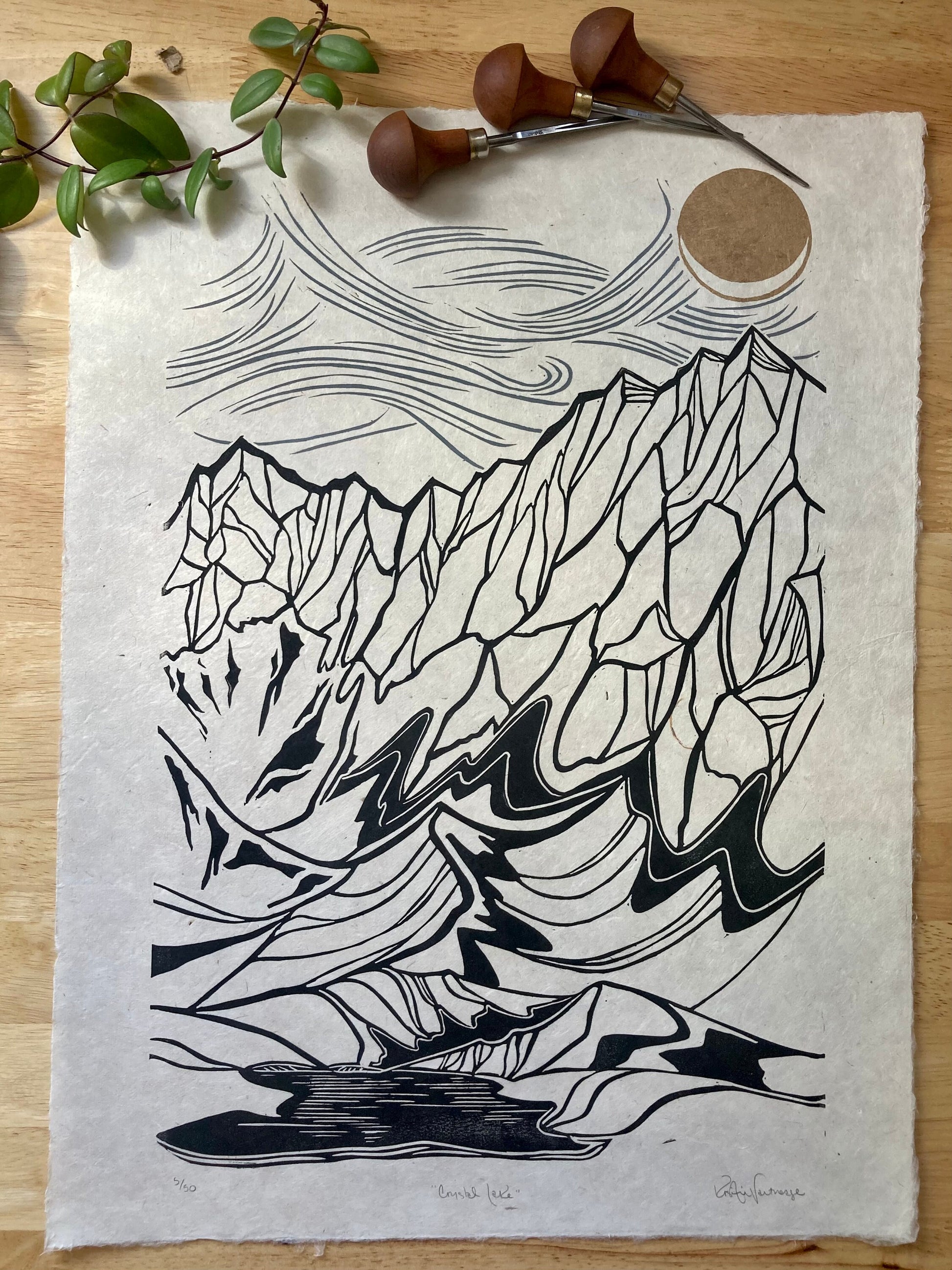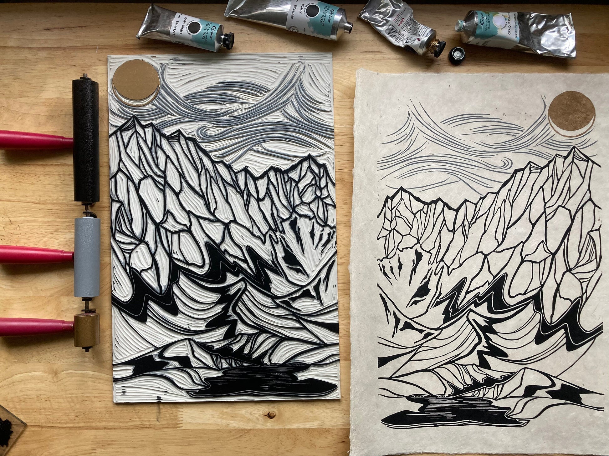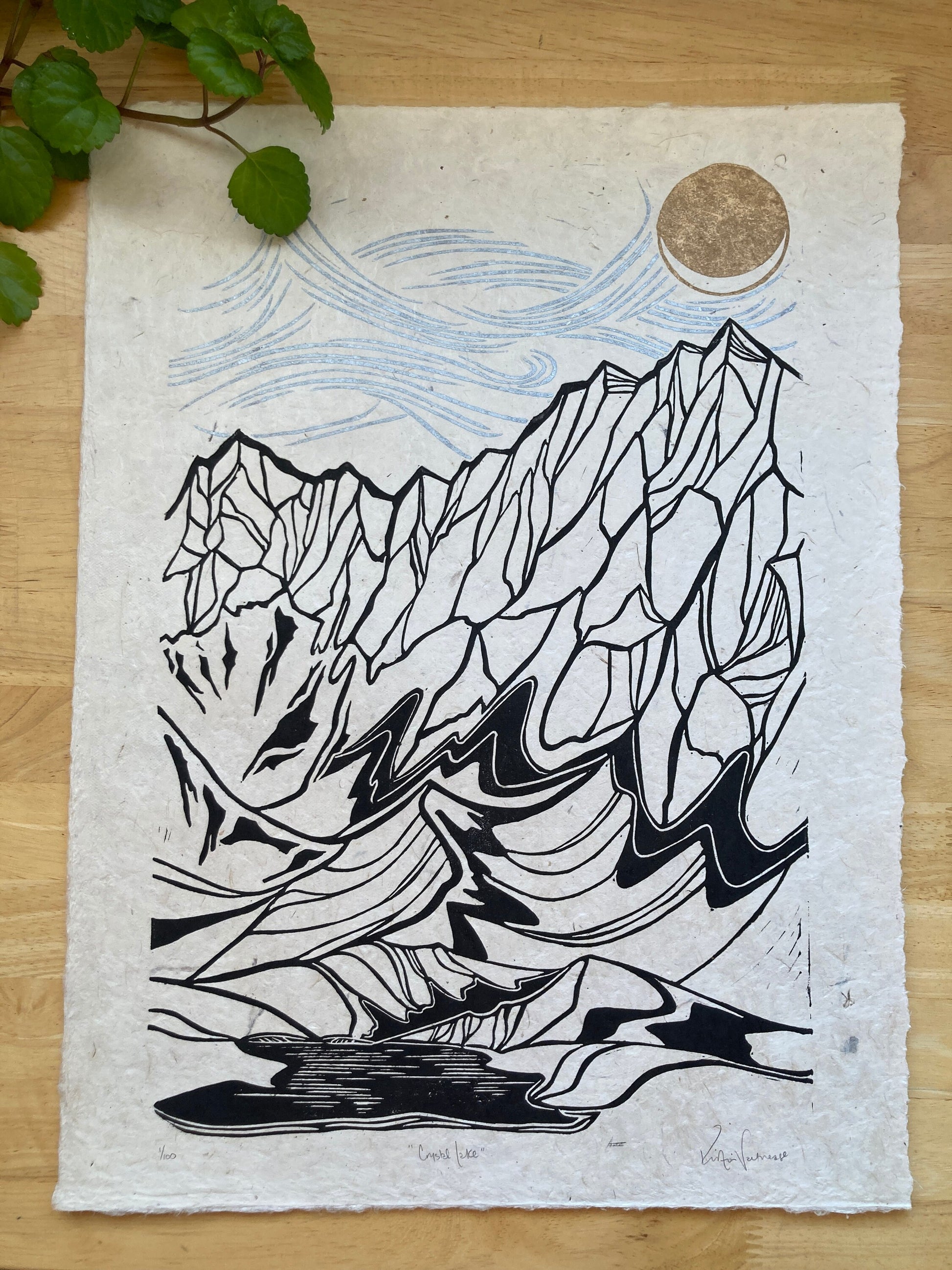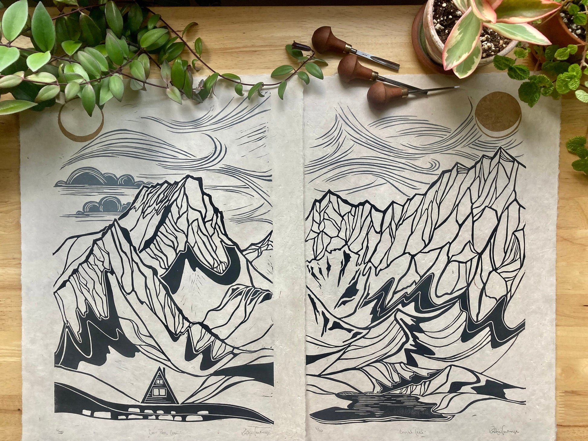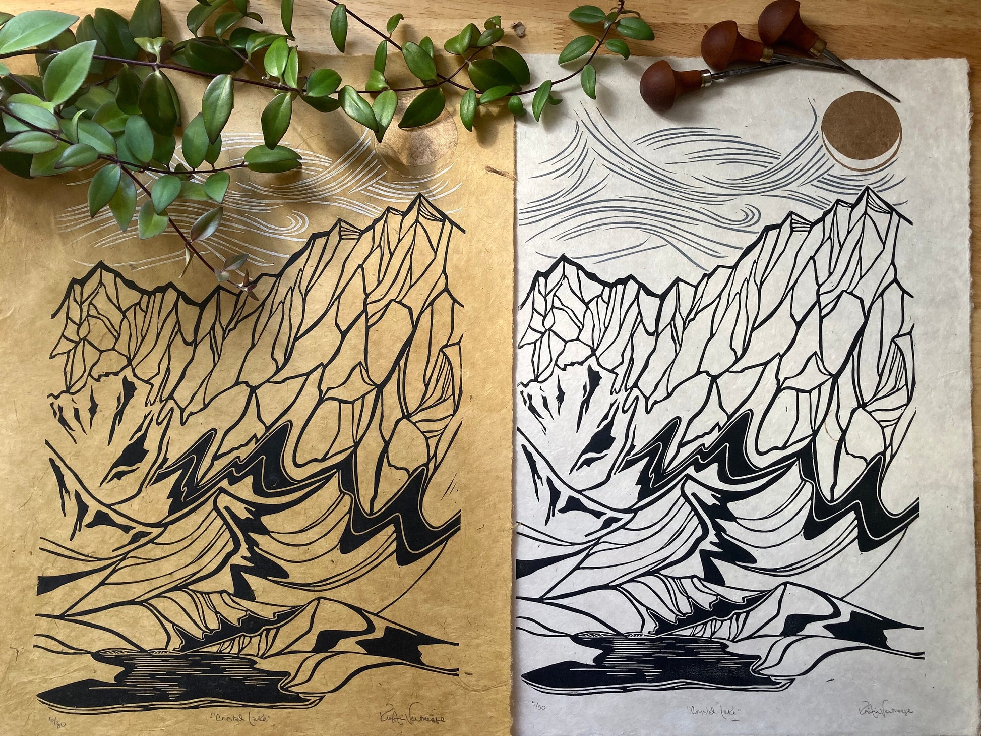 Each linocut print is individually inked and pressed using archival, oil-based inks on naturally textured Lokta paper. This is a sustainable paper, handmade in Nepal with gorgeous flecks of fiber and texture. Each print is pressed by me, with unique variations from print to print, beautifully original.