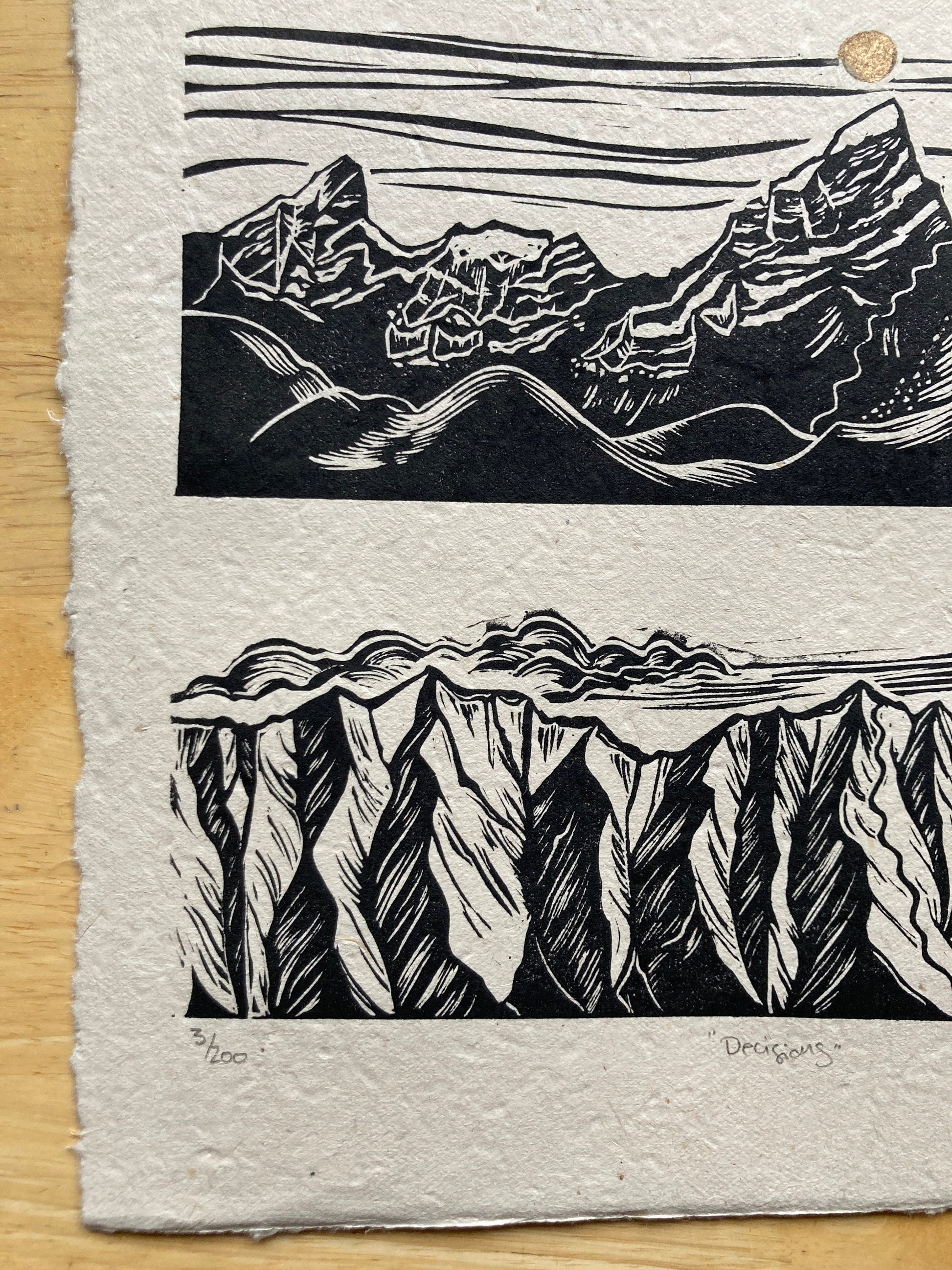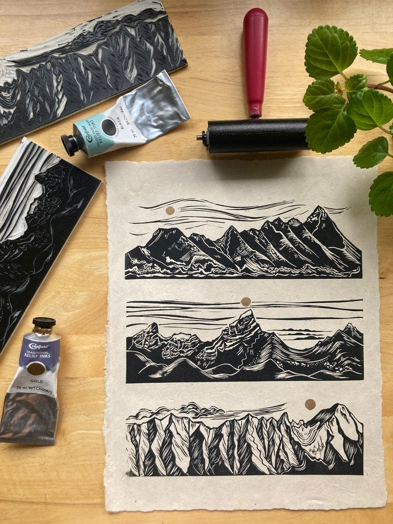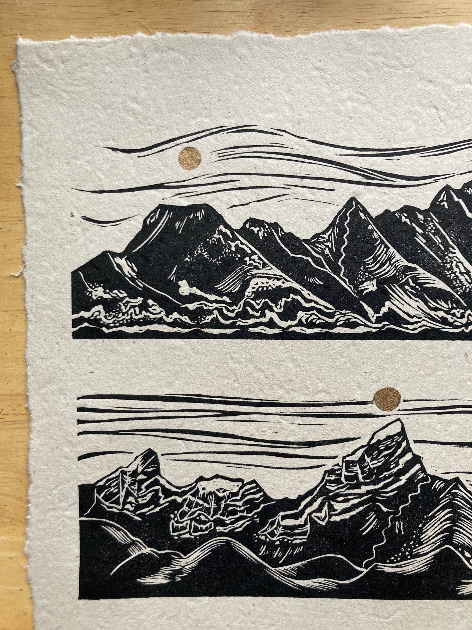 Prints are individually inked and pressed using archival, oil-based inks on beautifully textured Lokta paper. Lokta is a sustainable paper, handmade in Nepal with gorgeous flecks of fiber and texture. Each print is pressed by me with unique variations from print to print, perfectly original.