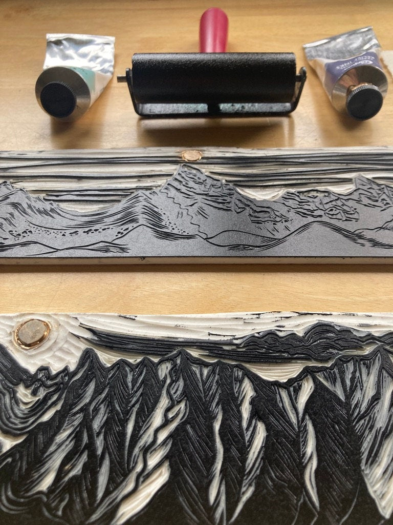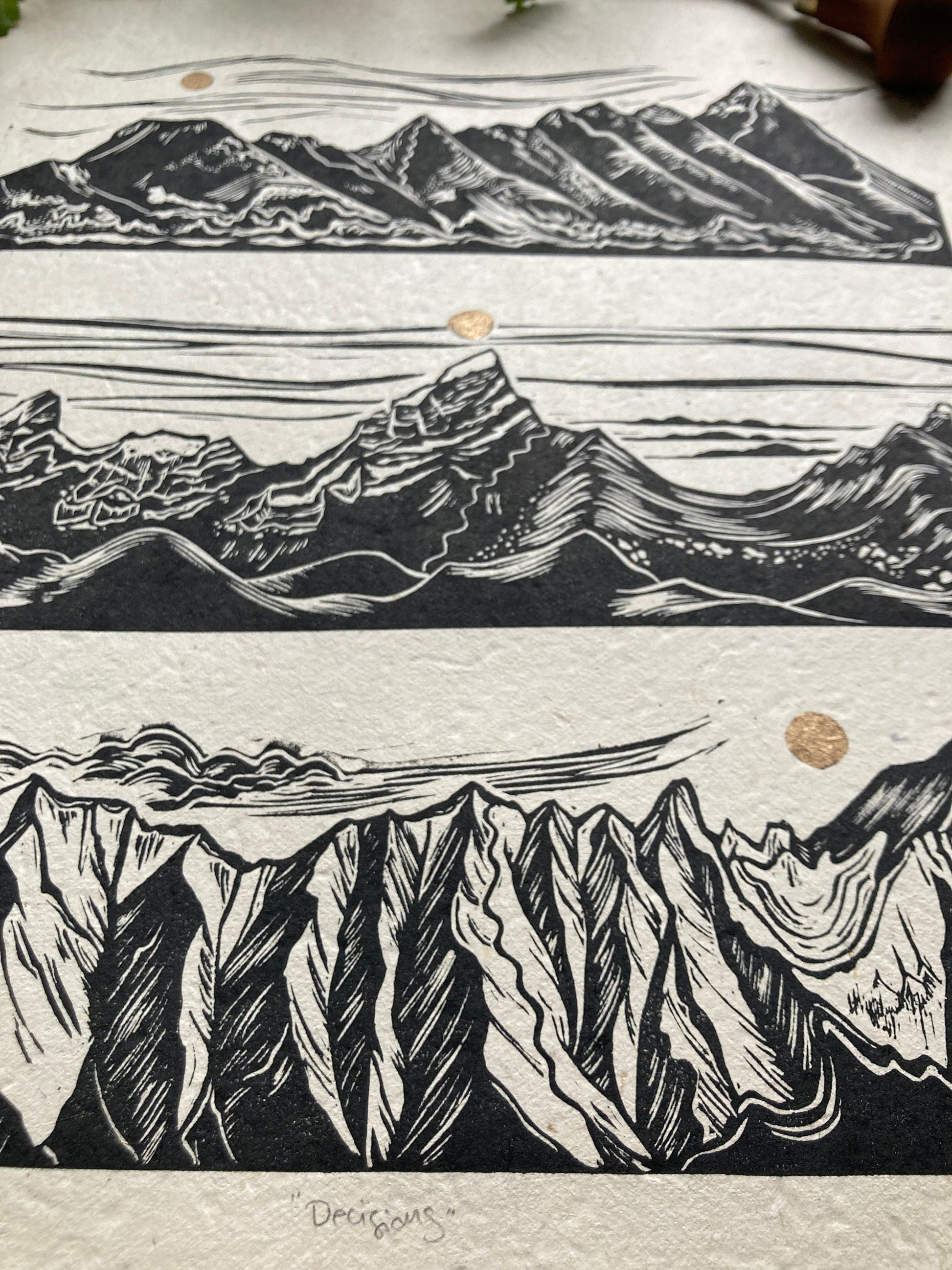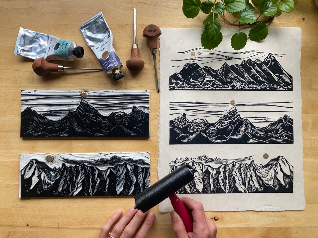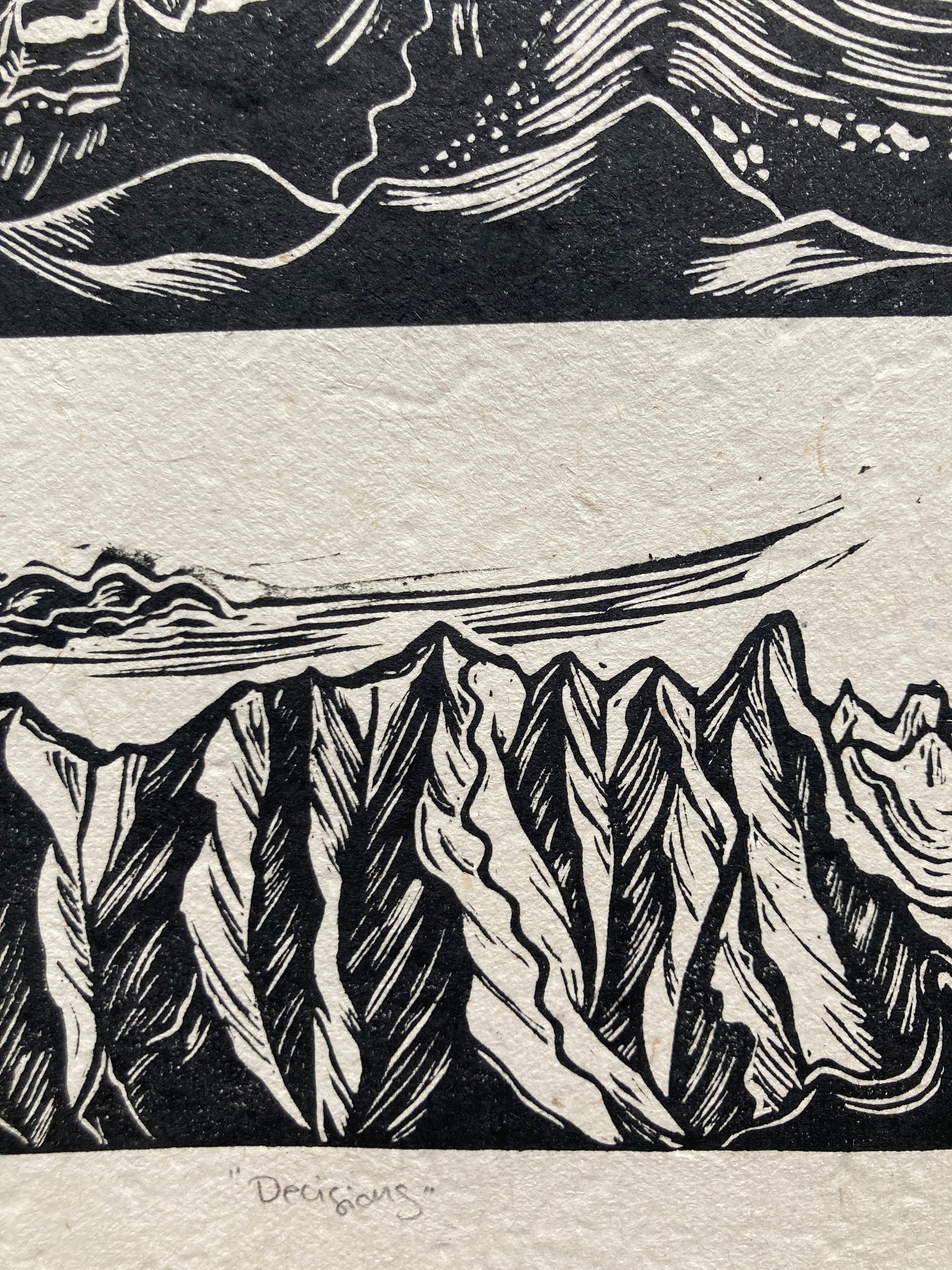Prints are individually inked and pressed using archival, oil-based inks on beautifully textured Lokta paper. Lokta is a sustainable paper, handmade in Nepal with gorgeous flecks of fiber and texture. Each print is pressed by me with unique variations from print to print, perfectly original.