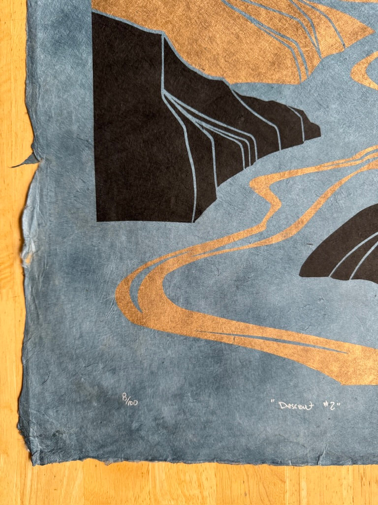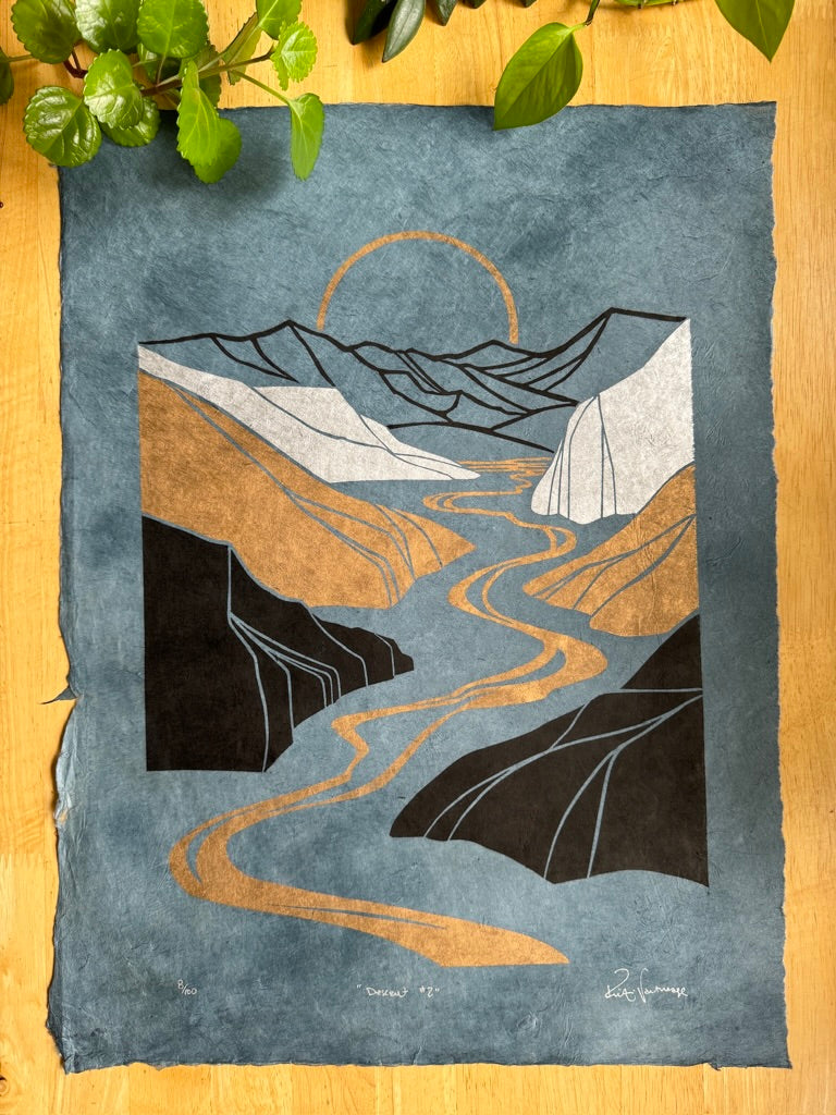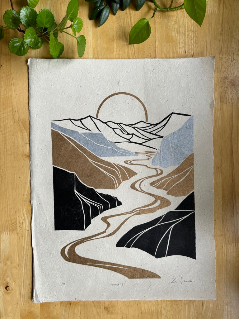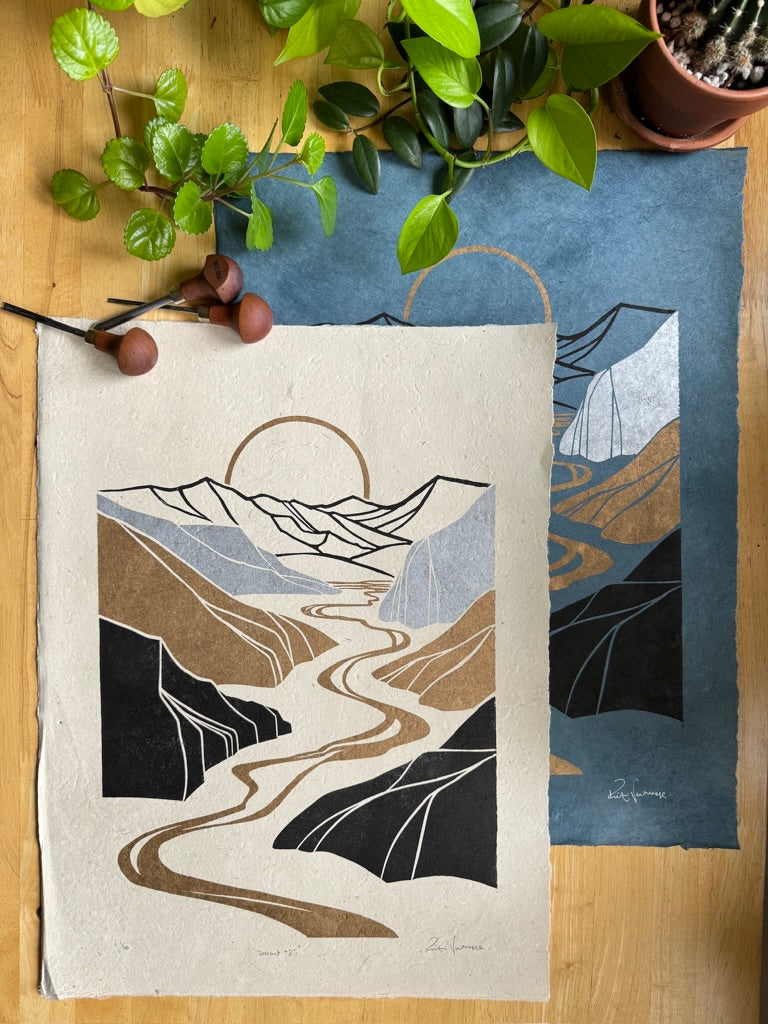 Prints are individually inked and pressed using archival, oil-based inks on beautifully textured Lokta paper. This is a sustainable paper, handmade in Nepal with gorgeous flecks of fiber and texture. Each print is pressed by me with unique variations from print to print, beautifully original.
