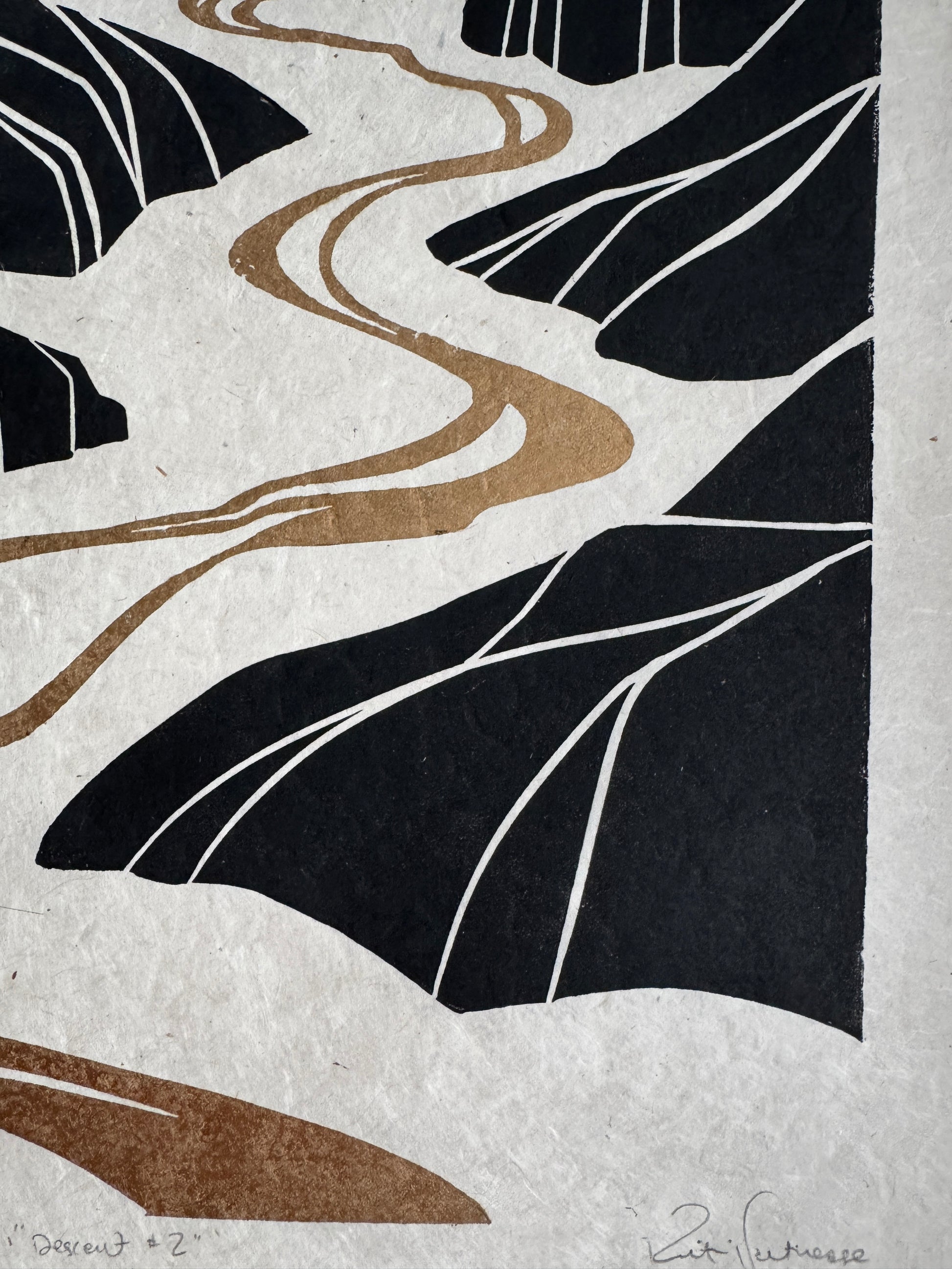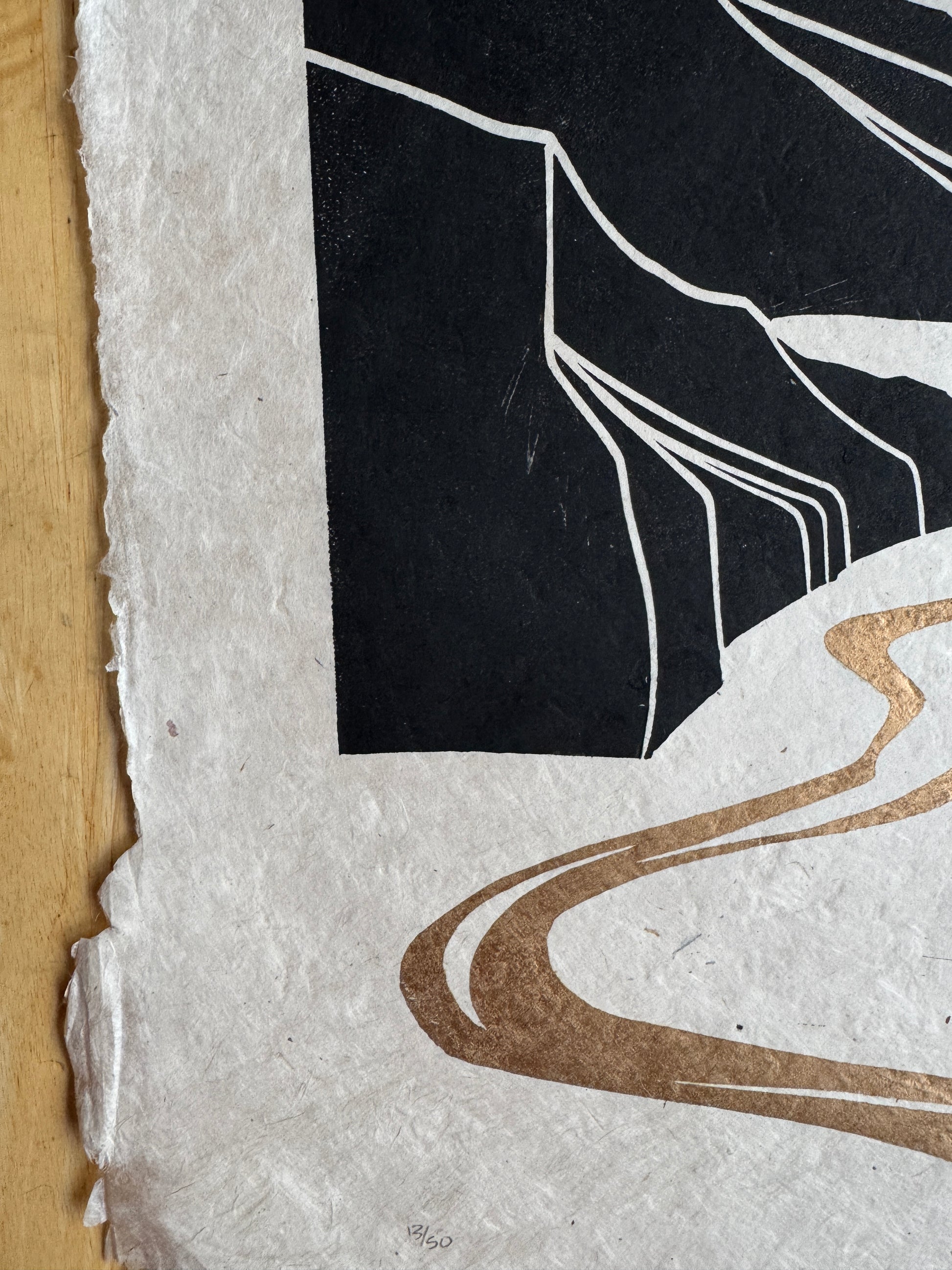 Prints are individually inked and pressed using archival, oil-based inks on beautifully textured Lokta paper. This is a sustainable paper, handmade in Nepal with gorgeous flecks of fiber and texture. Each print is pressed by me with unique variations from print to print, beautifully original.