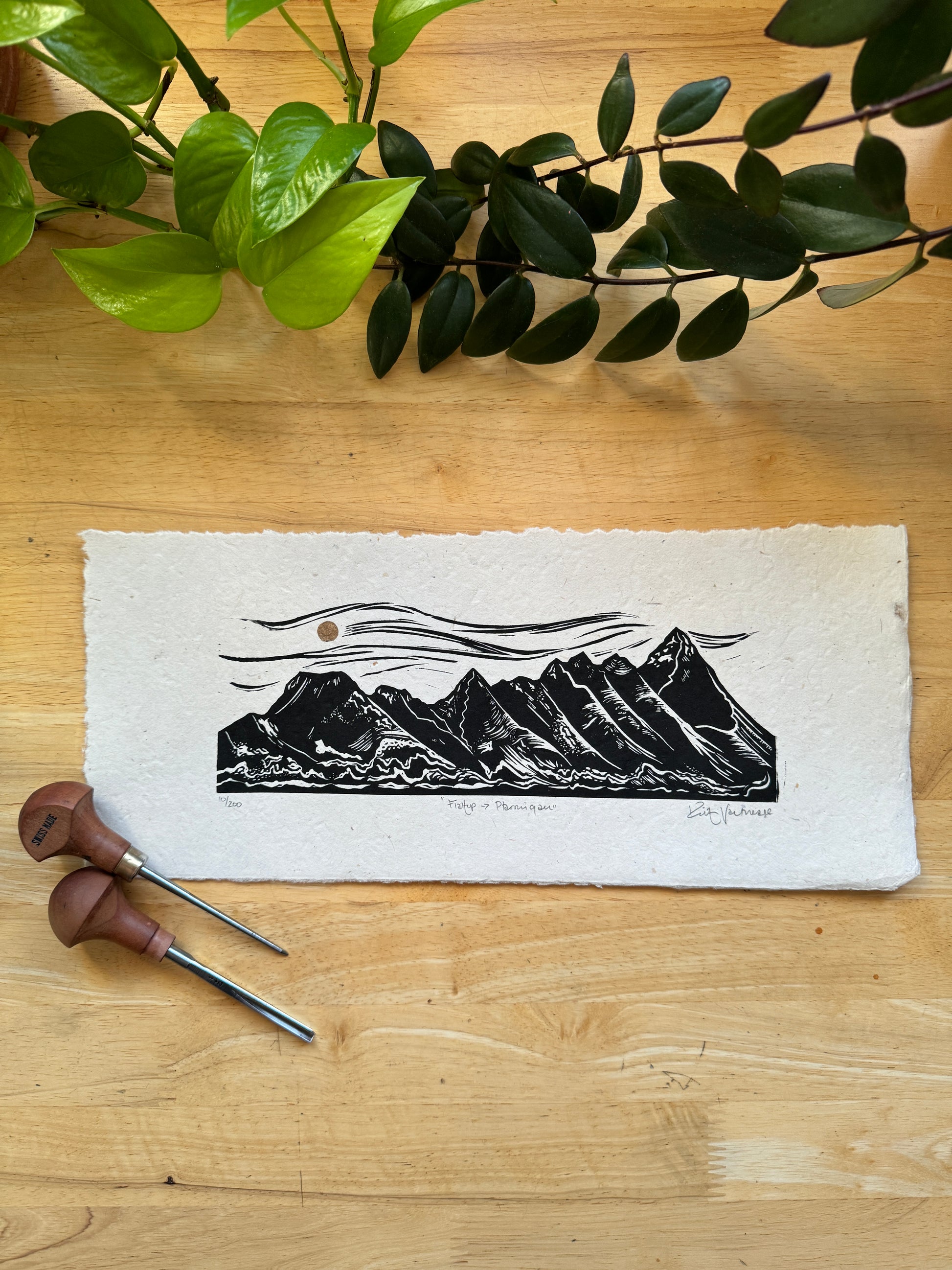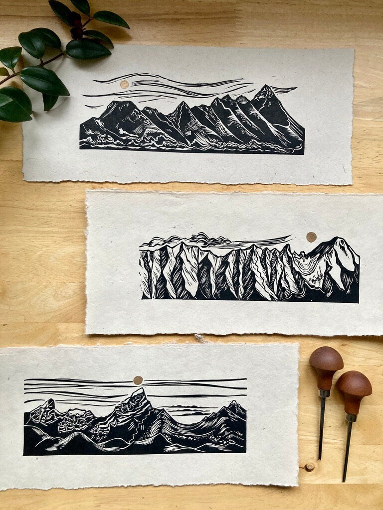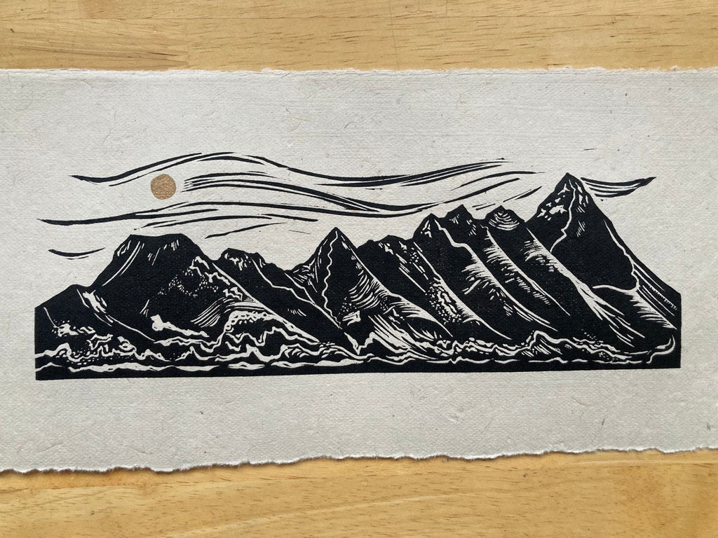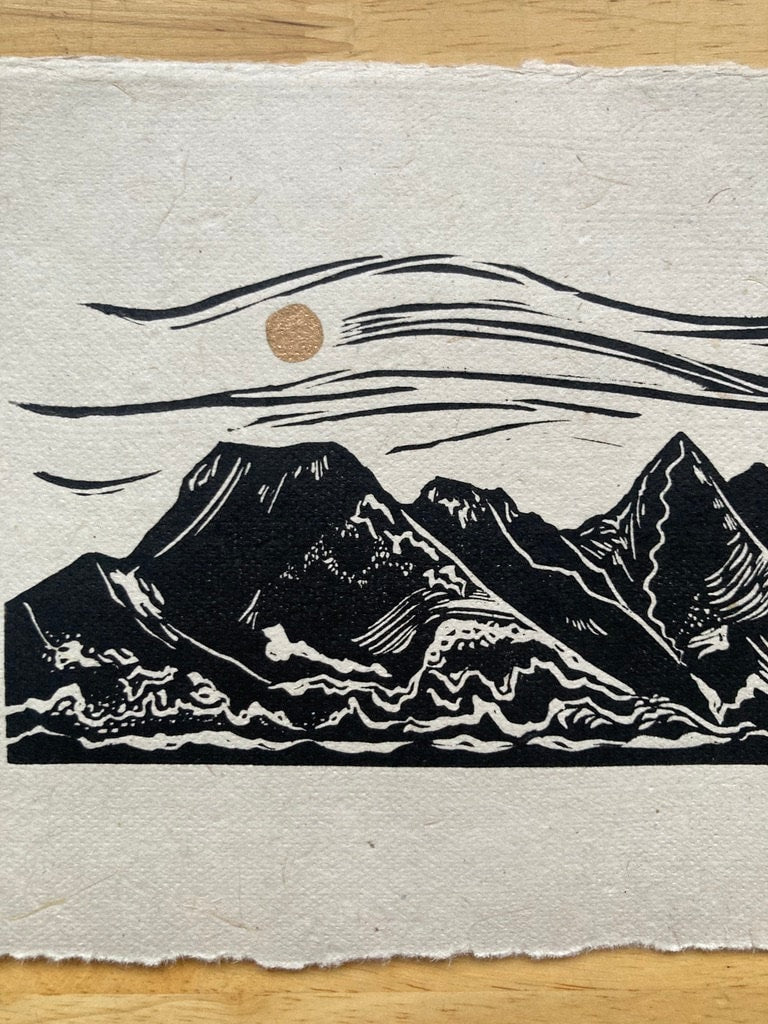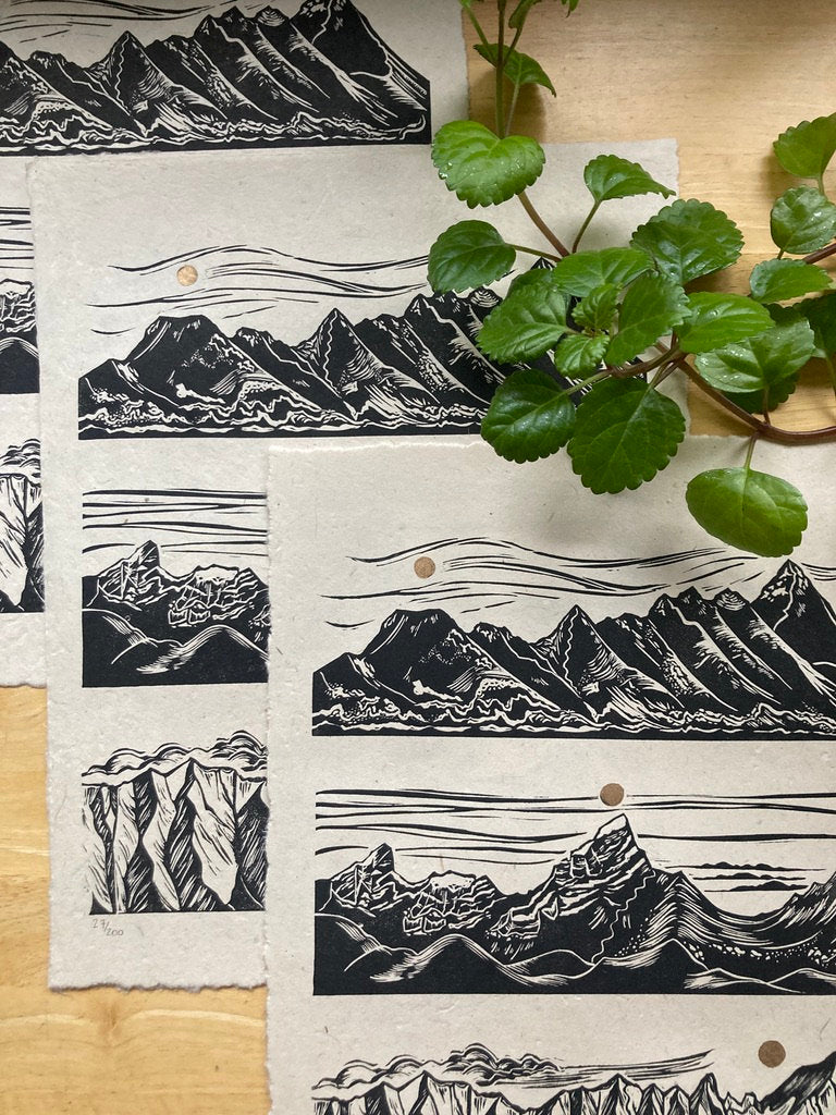 Prints are individually inked and pressed using archival, oil-based inks on beautifully textured Lokta paper. Lokta is a sustainable paper, handmade in Nepal with gorgeous flecks of fiber and texture. Each print is pressed by me with unique variations from print to print, perfectly original.