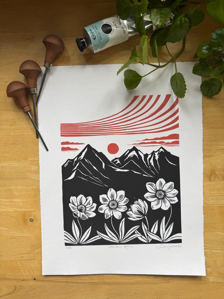 Original 12"x18" 'Mountain Avens on Bird Ridge Viewpoint' linocut print with magnetic wooden frames.