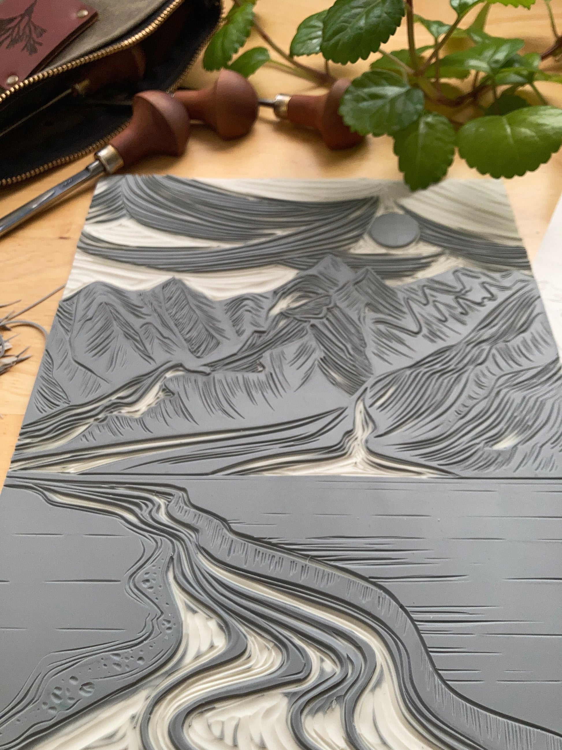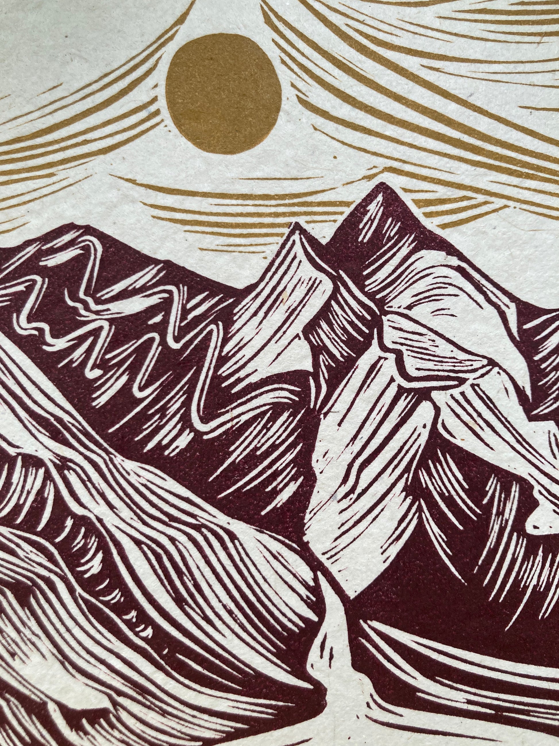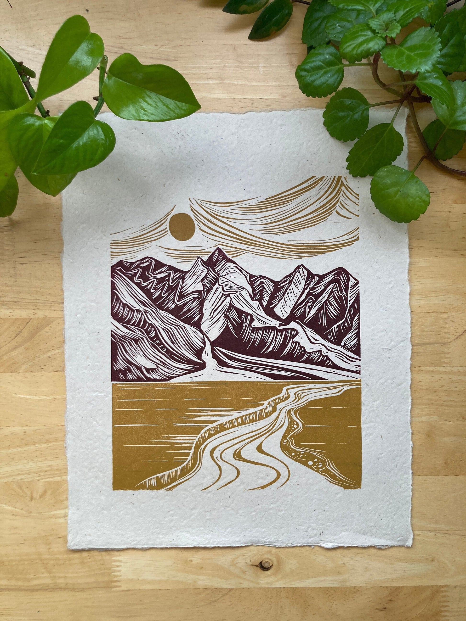 Prints are individually inked and pressed using archival, oil-based inks on beautifully textured Lokta paper. Lokta is a sustainable paper, handmade in Nepal with gorgeous flecks of fiber and texture. Each print is pressed by me with unique variations from print to print, perfectly original.
