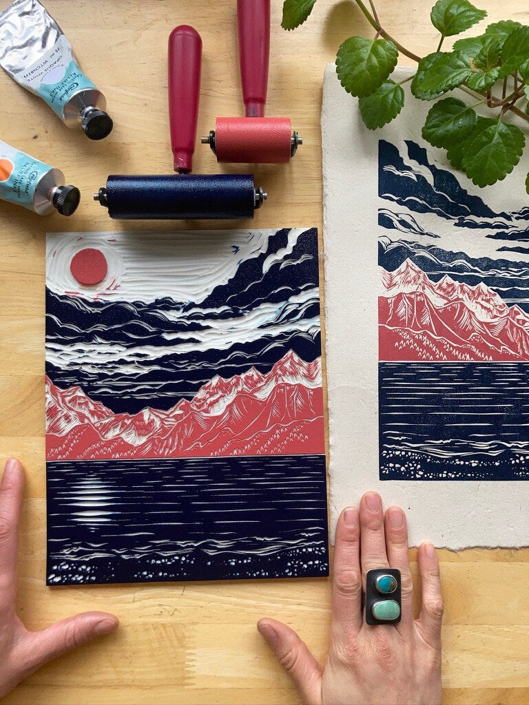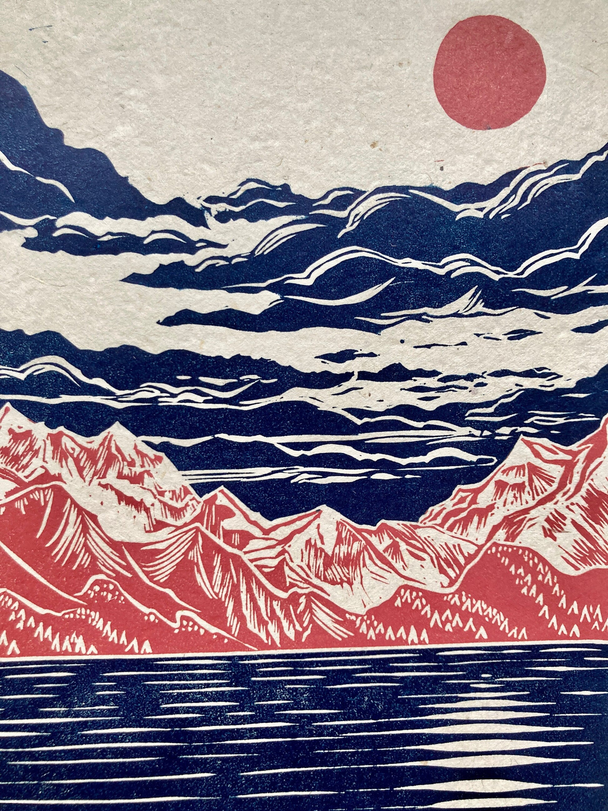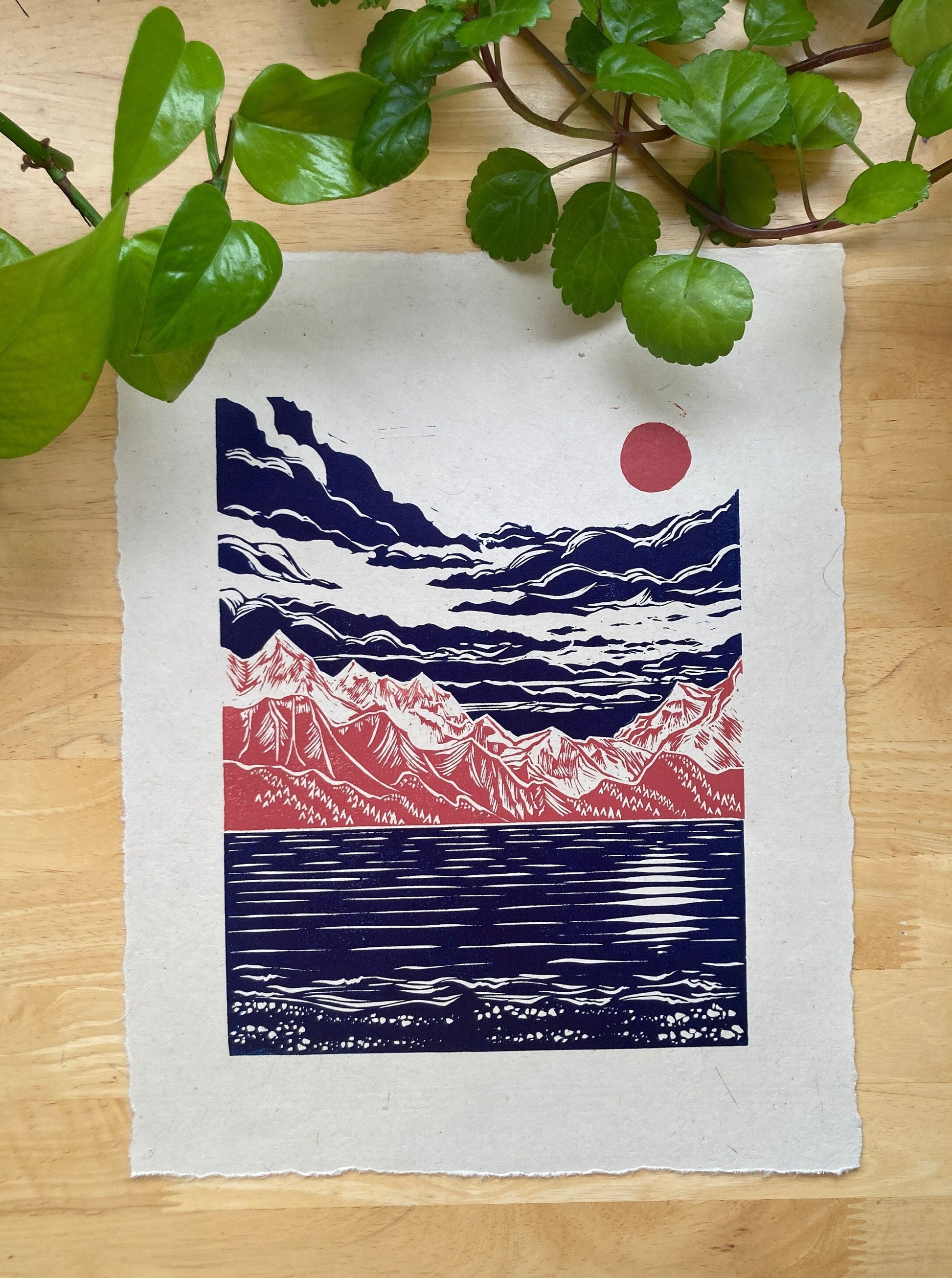 Prints are individually inked and pressed using archival, oil-based inks on beautifully textured Lokta paper. Lokta is a sustainable paper, handmade in Nepal with gorgeous flecks of fiber and texture. Each print is pressed by me with unique variations from print to print, perfectly original.