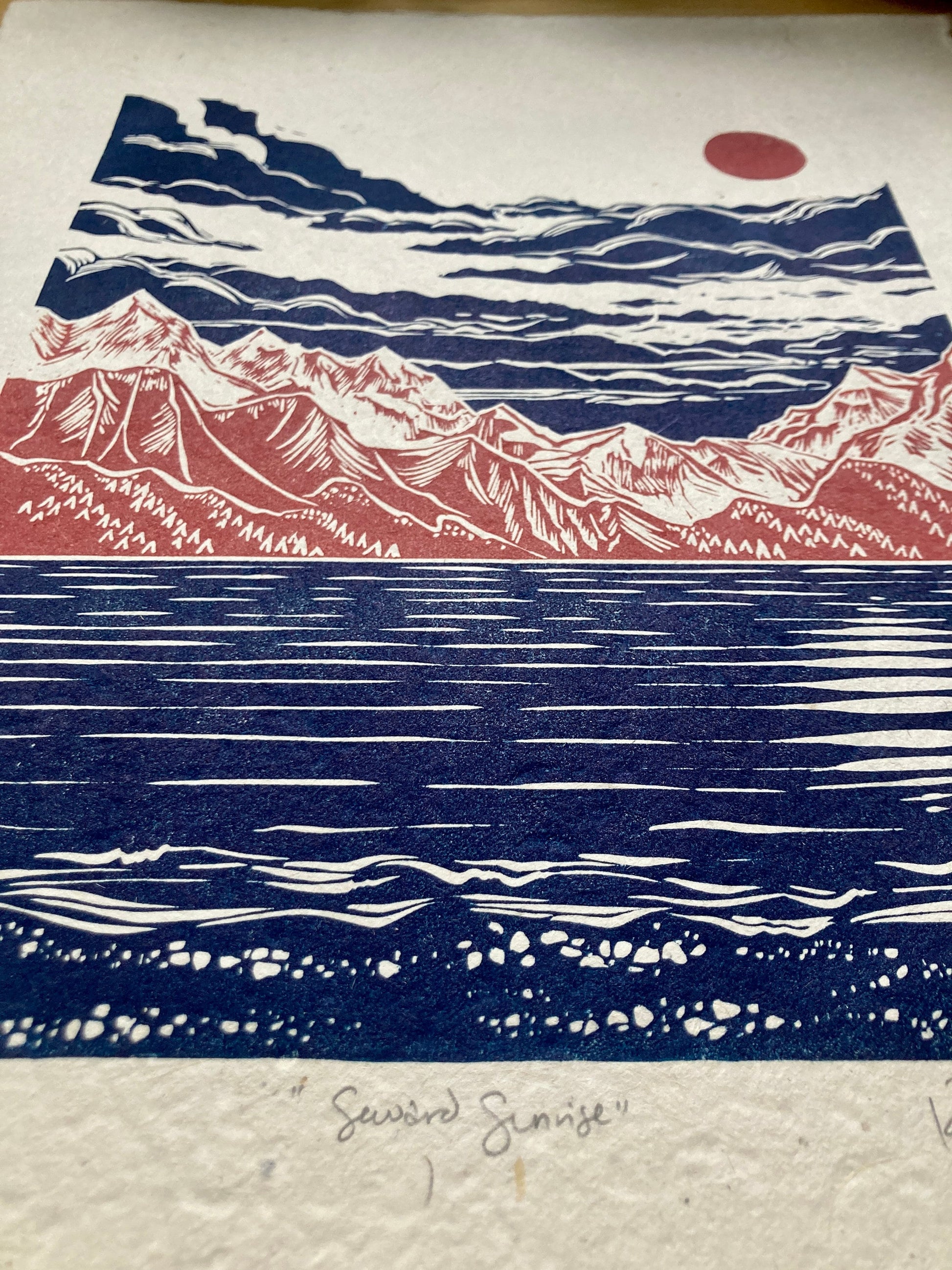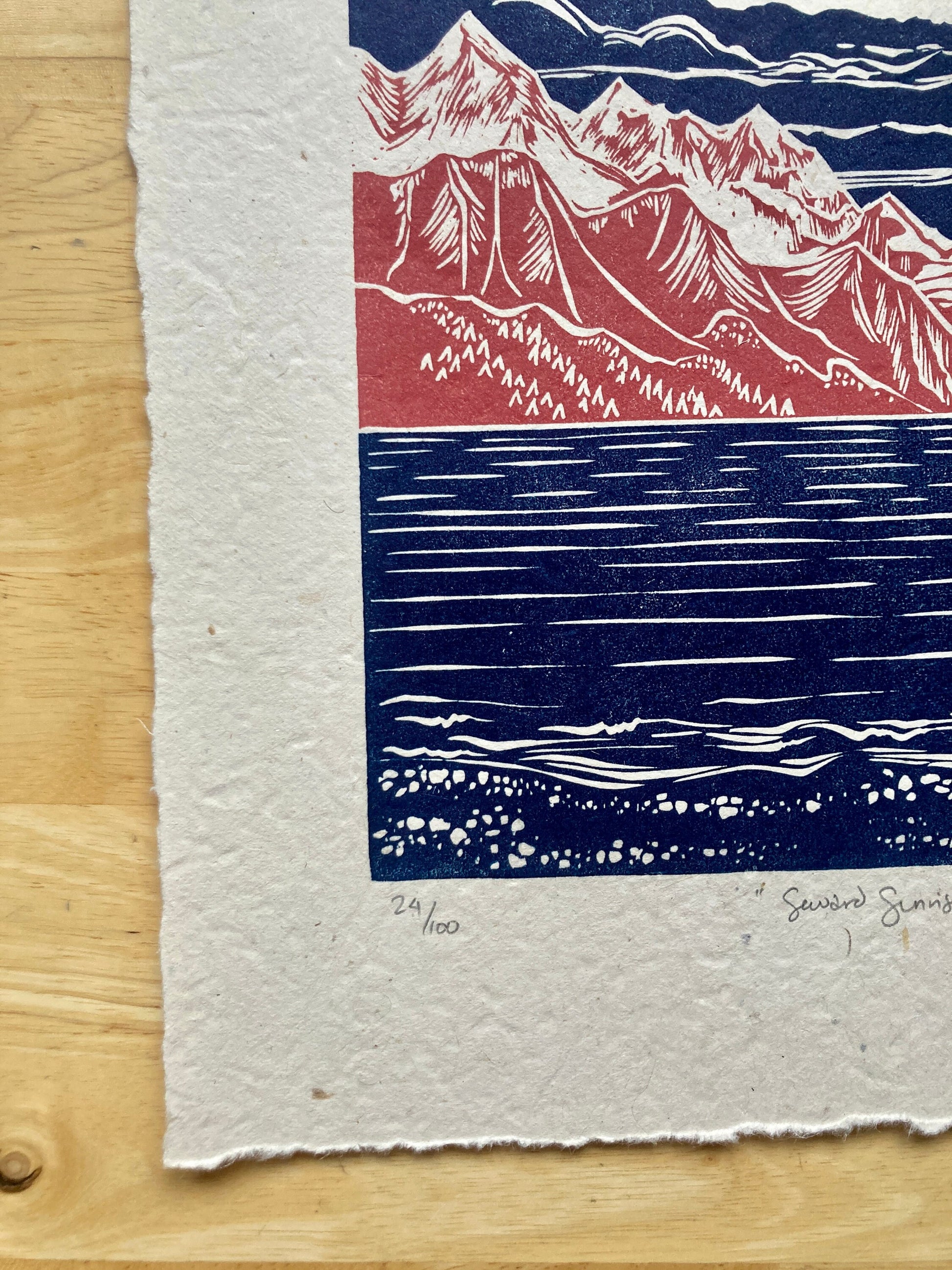This print was inspired by a spring beach trip to Seward, AK with my friend and her daughter. Rosy + blue hues illuminated the clouds as we beachcombed along the tidelines.