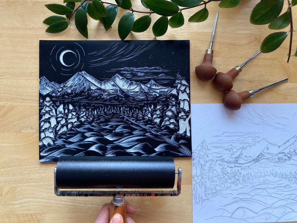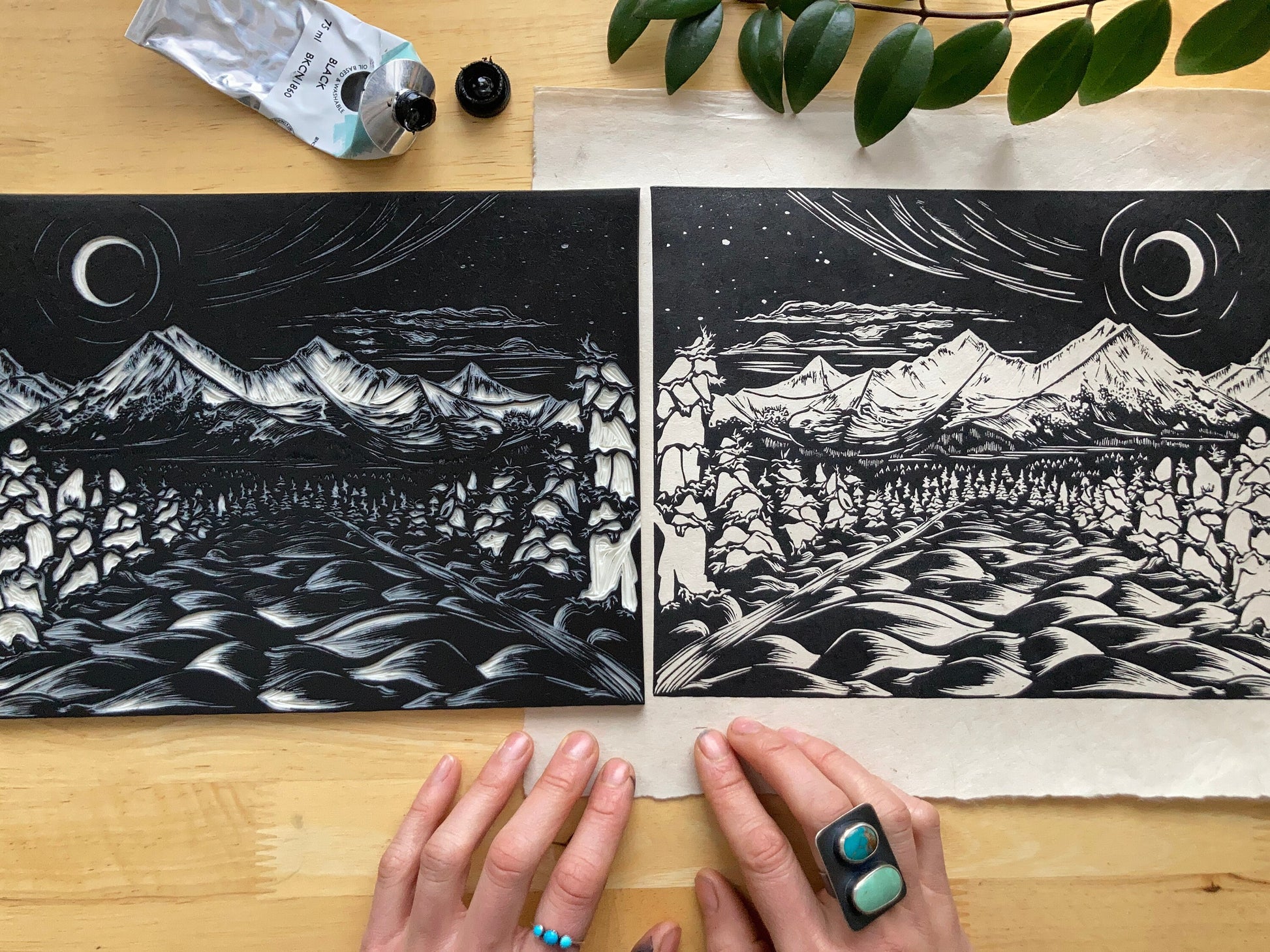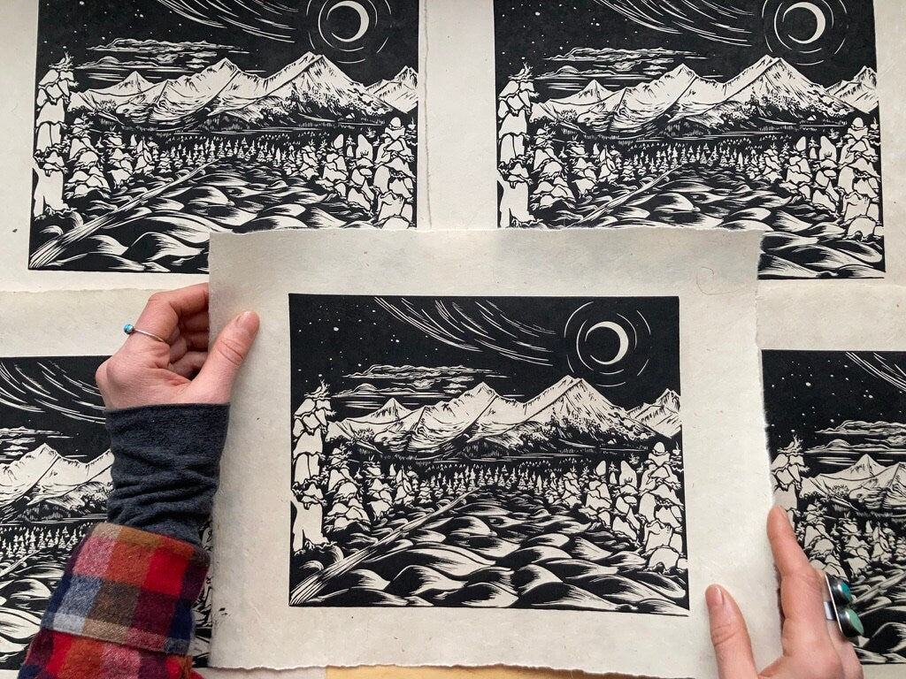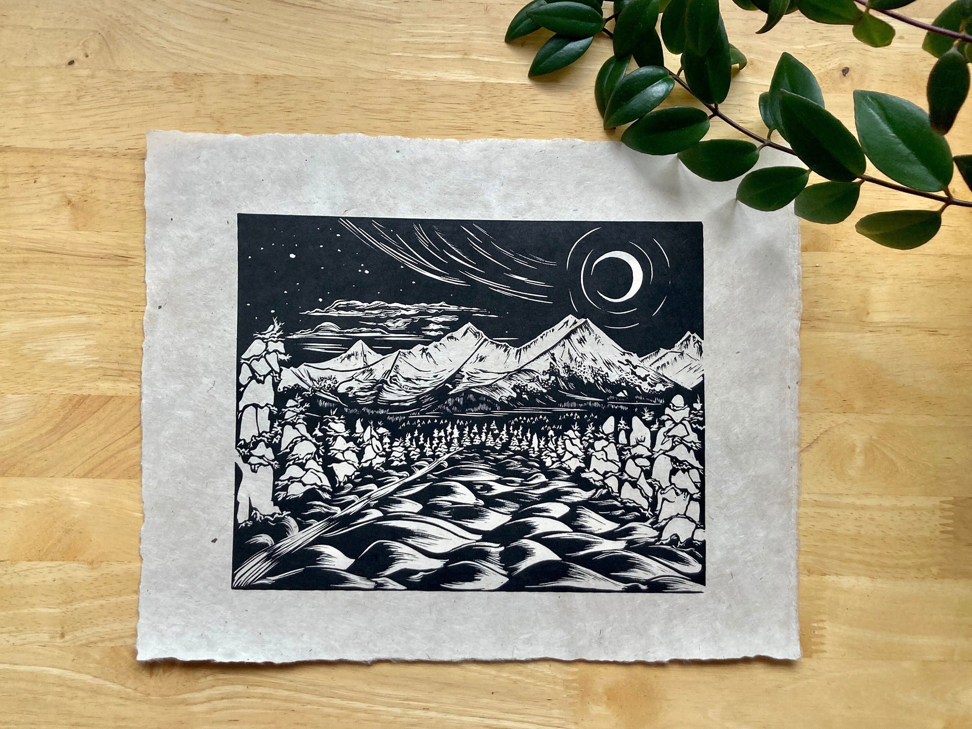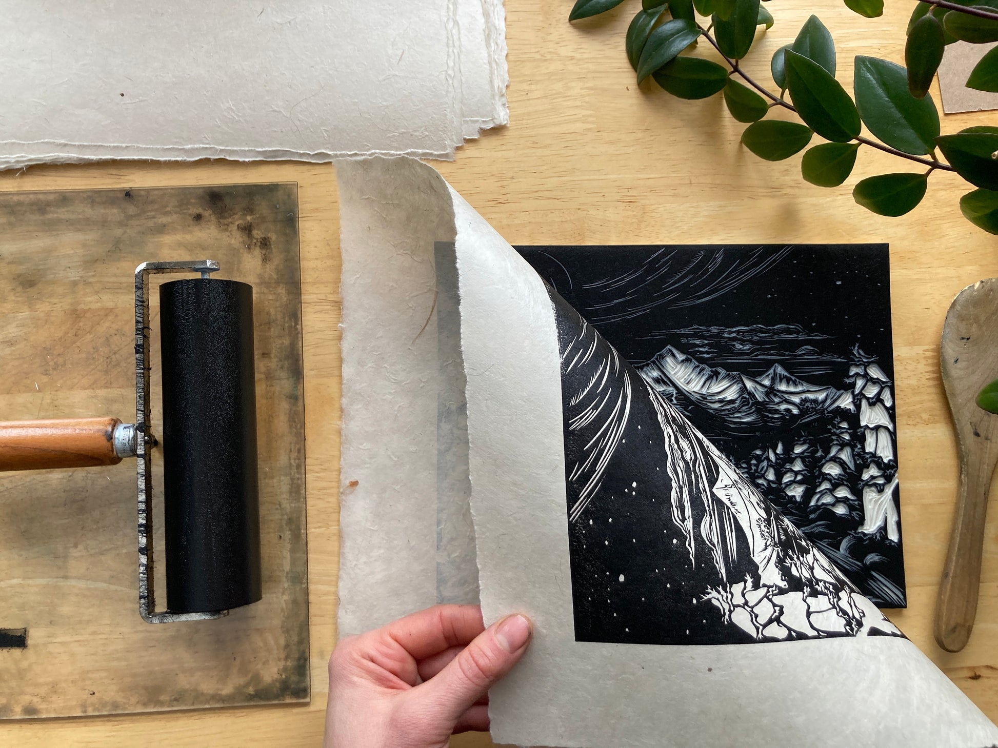 Printed using oil-based archival quality, velvety black ink on acid free, natural Lokta paper. This is a sustainable paper, handmade in Nepal, with gorgeous flecks of fiber and texture - due to the handmade nature, sizing is not exact!