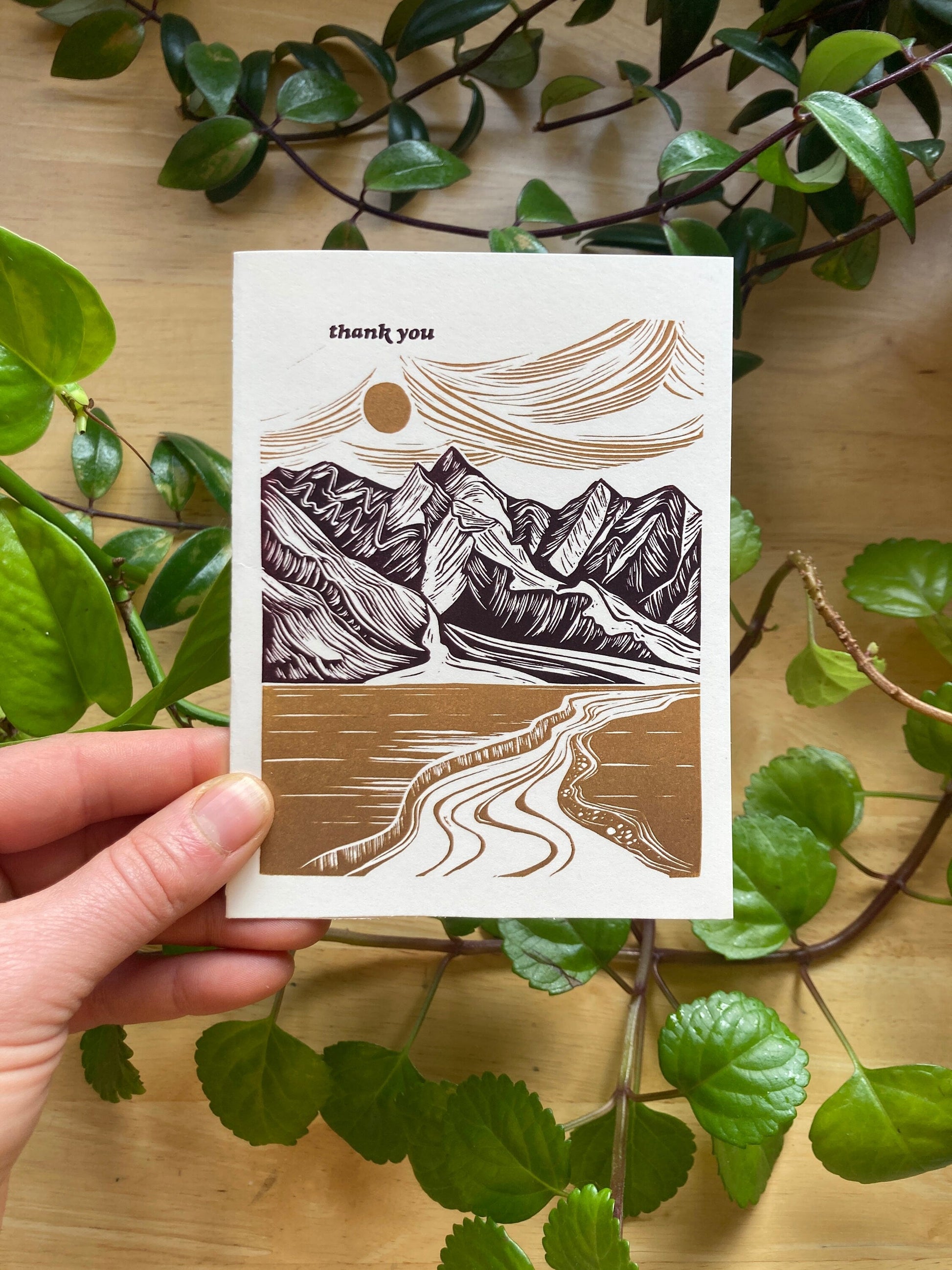 Cards are printed locally in Anchorage and come with a Kraft envelope made with 100% recycled materials. Each card started out as an original linocut print inspired by the places I love around AK: