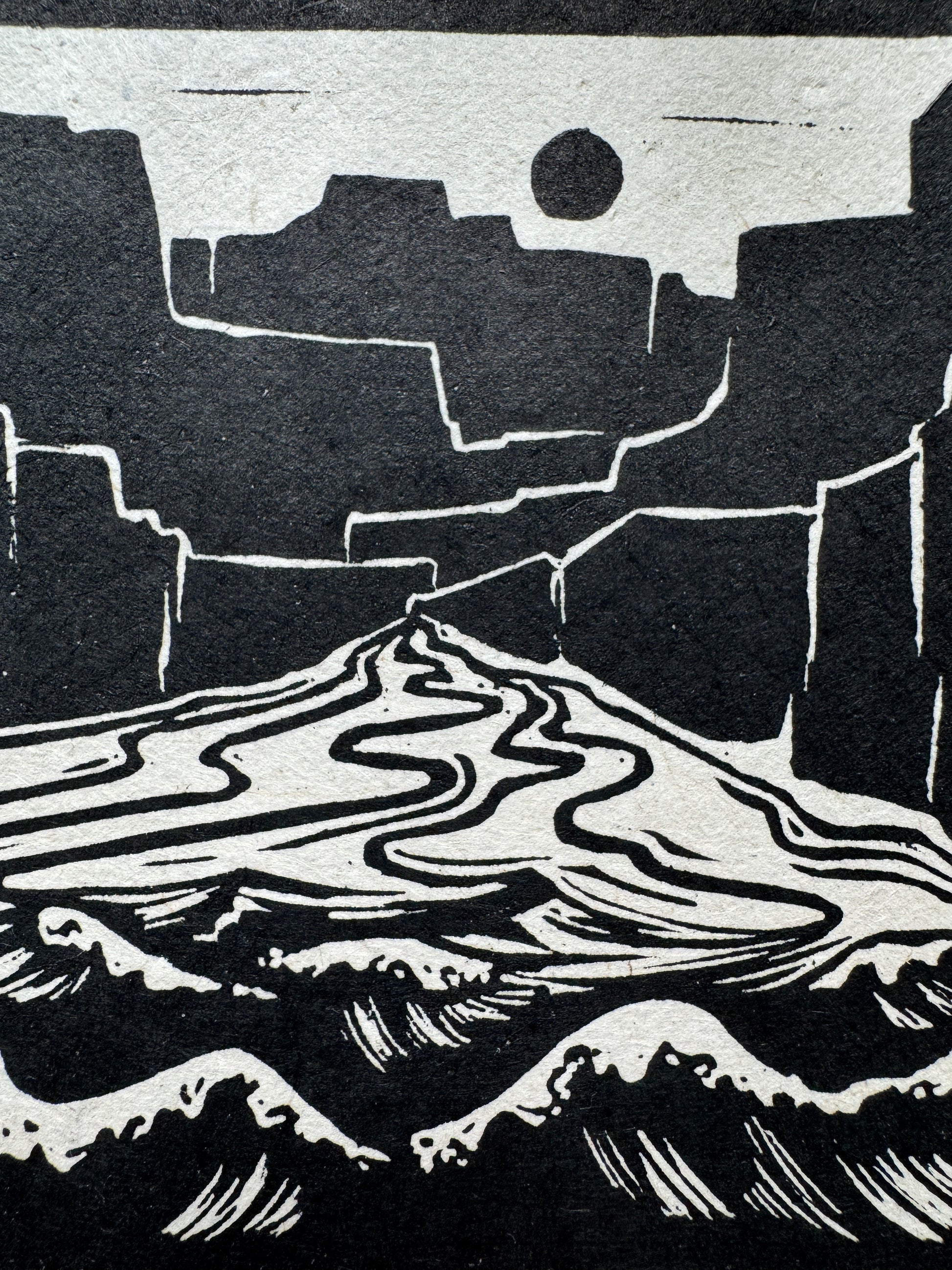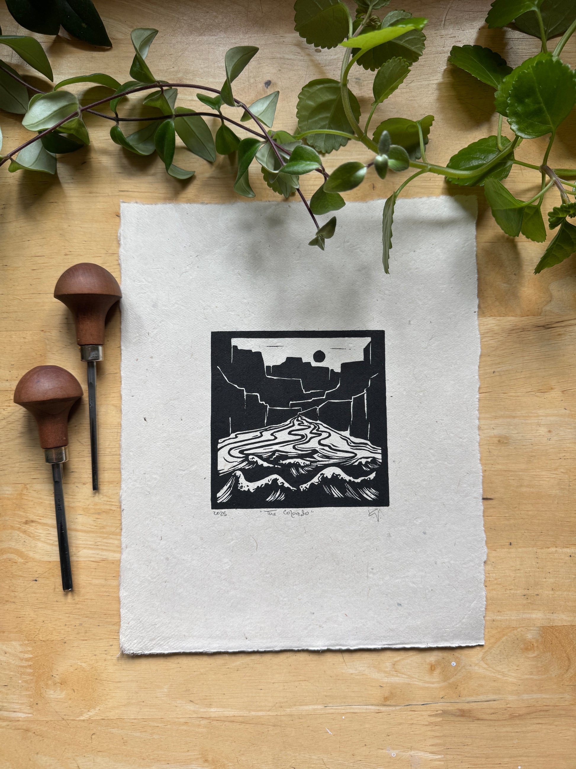 This print features the high canyon walls and whitewater of the Colorado River. Part of a series of three river prints inspired by the poetry of William Stafford.