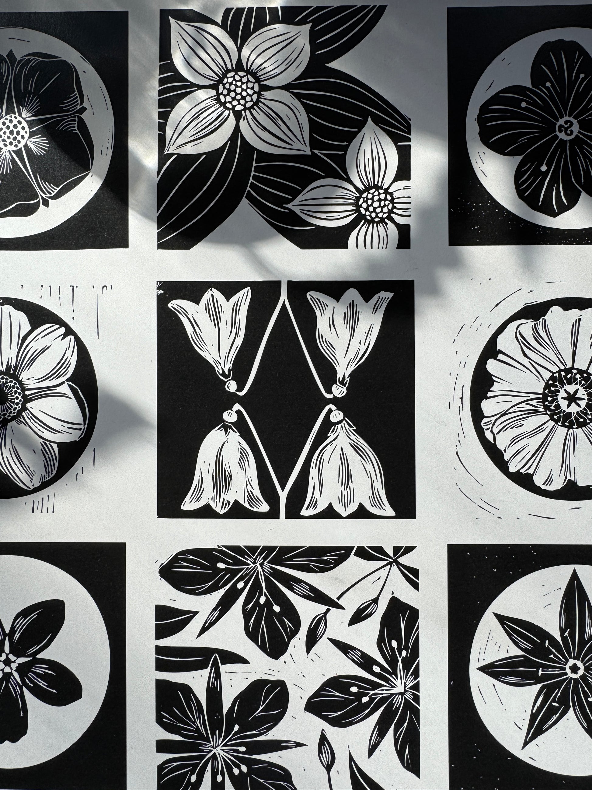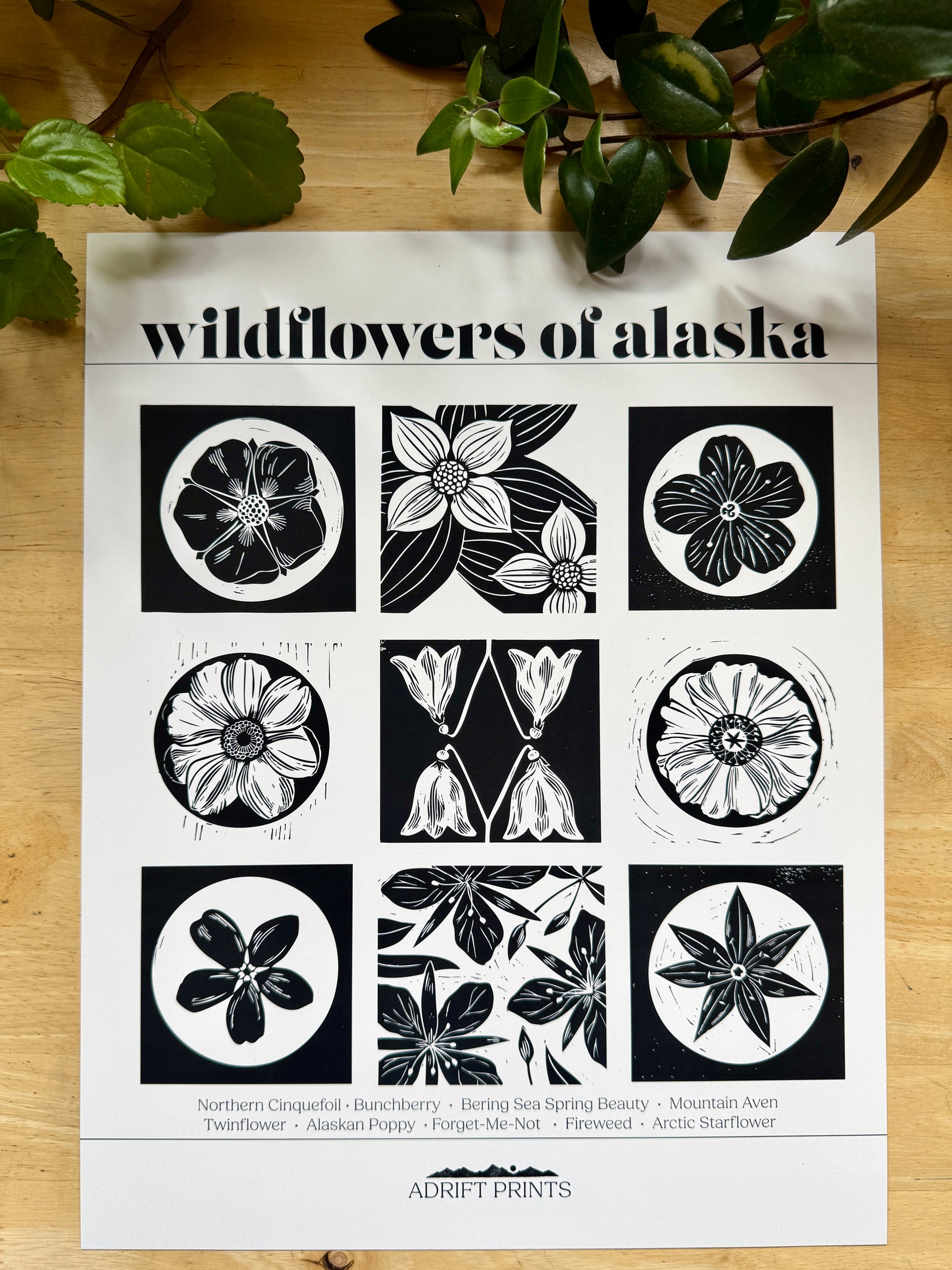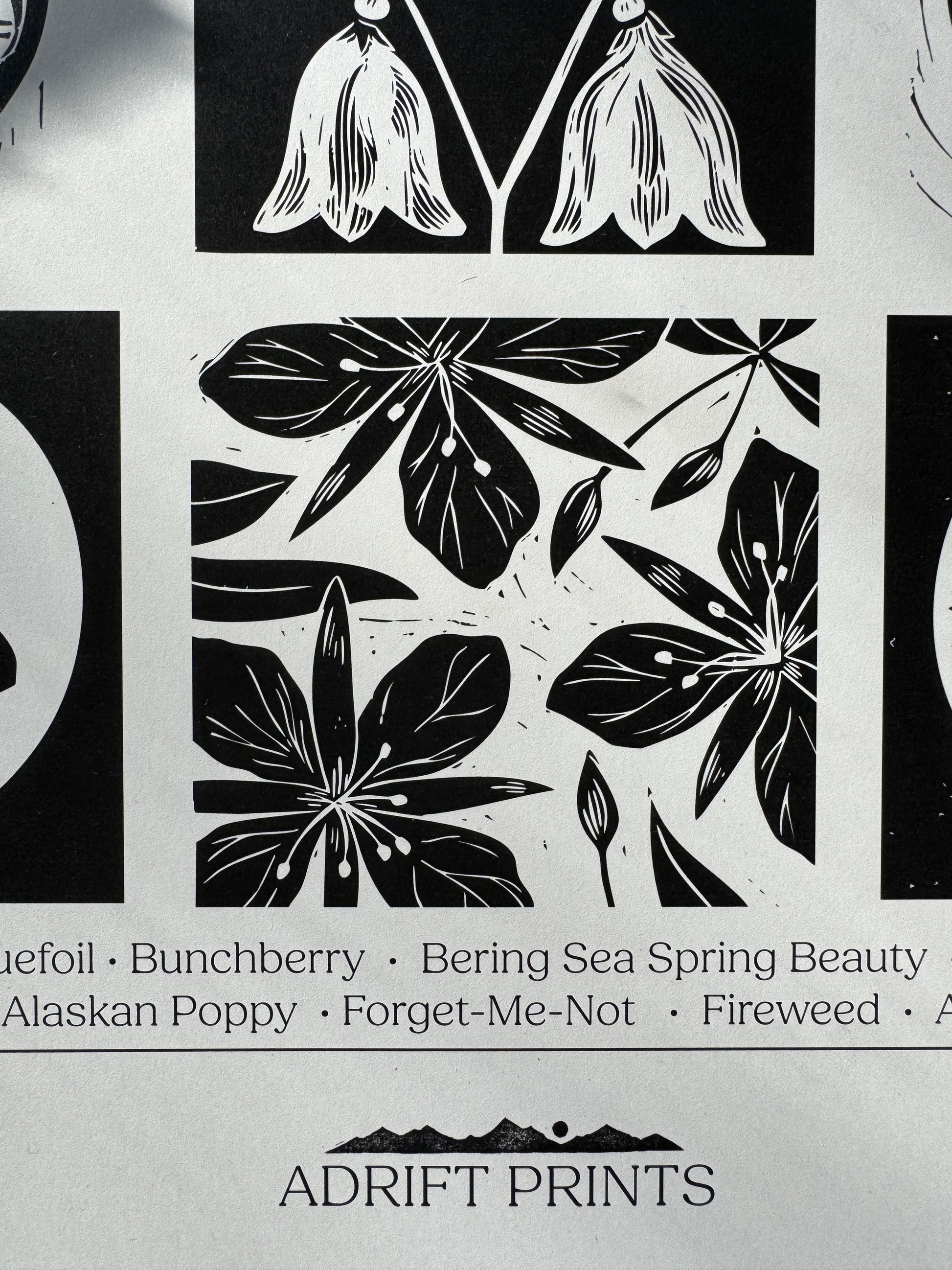 This poster features nine of my favorite Alaskan wildflowers ranging from tiny forget-me-nots to fireweed. Originally these designs were part of a large 3'x3' print that was pressed by a steamroller at Print Fiesta in NM, and now available in a smaller more frame-able format!